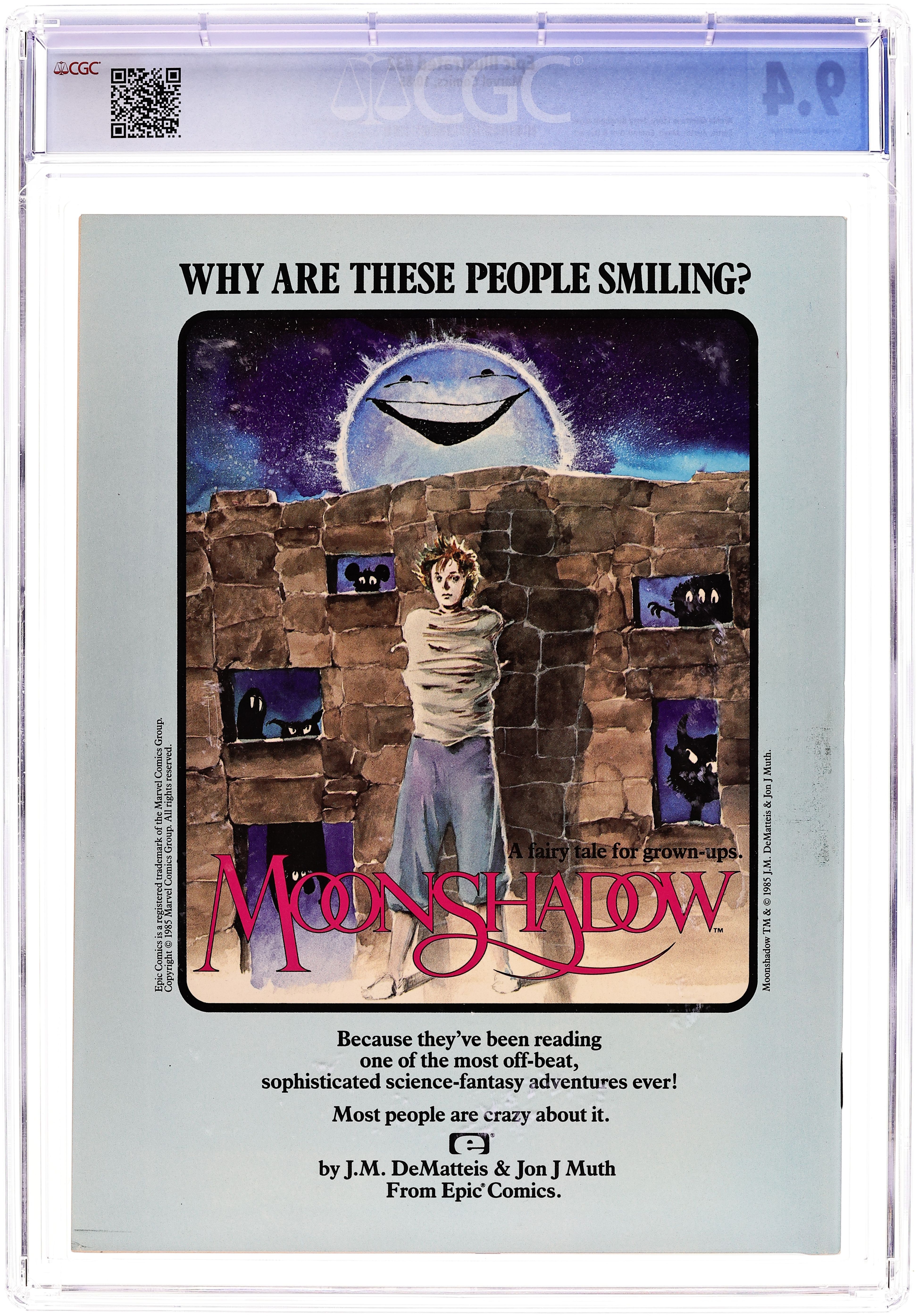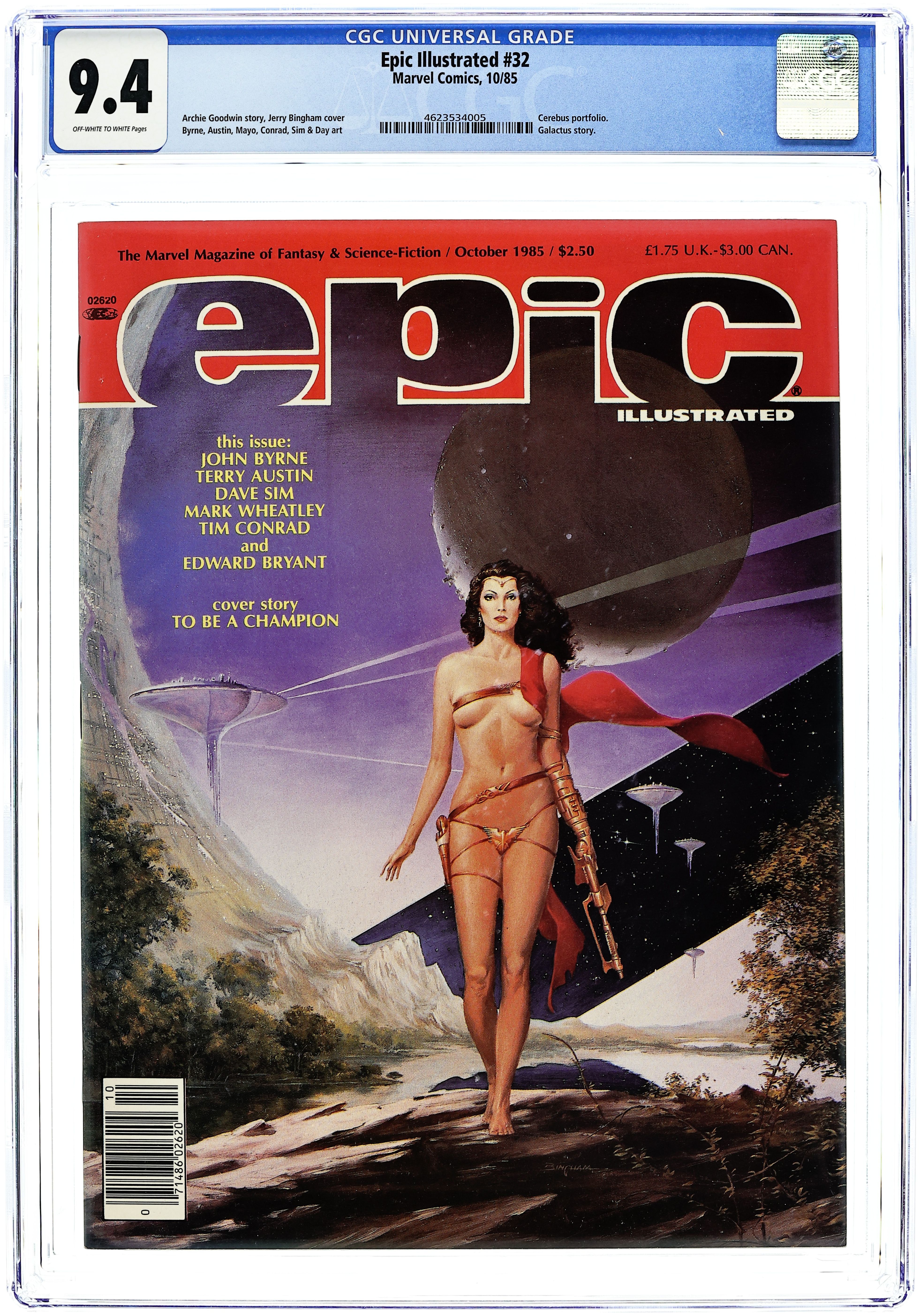 Cover art by Berni Wrightson. The End of the Earth (Chapter Five) (Table of Contents)--The Last Galactus Story, script and pencils by John Byrne, inks by Terry Austin. Selling Insurance starring Cerebus, script by Dave Sim, pencils by Dave Sim and Gerhard (backgrounds), inks by Dave Sim and Gerhard. The Girl Next Door starring Cerebus, script by Dave Sim, pencils by Dave Sim and Gerhard (backgrounds), inks by Dave Sim and Gerhard. Infinity: Where Rock and Fantasy Art Meet article, art by Glenn Pepple, Anita Barbour, Daina Graziunas, Jim Starlin, Berni Wrightson, Jeffrey Jones, Alin Wilson, Jon Jay Muth, Dan Green, and Alex Bialy. Cobalt- 60 story, script by Larry Todd, art by Mark Bode. Unicorn Autumn text story by Archie Goodwin, art by Alix Berenzy. Mediaview article by Dennis O'Neil. The Sign, script by Jo Duffy, pencils by Kent Williams. An Epic History featuring Dreadstar article by James P. Starlin. Raven Banner Marvel Graphic Novel Preview, script by Alan Zelenetz, art by Charles Vess. Journey to Outer Earth, script and art by Rick Geary. Toadswart story, script and art by Tim Conrad. The Fix, script and art by Pepe Moreno. 100 pgs. June, 1985. $2.50. Cover price $2.50.