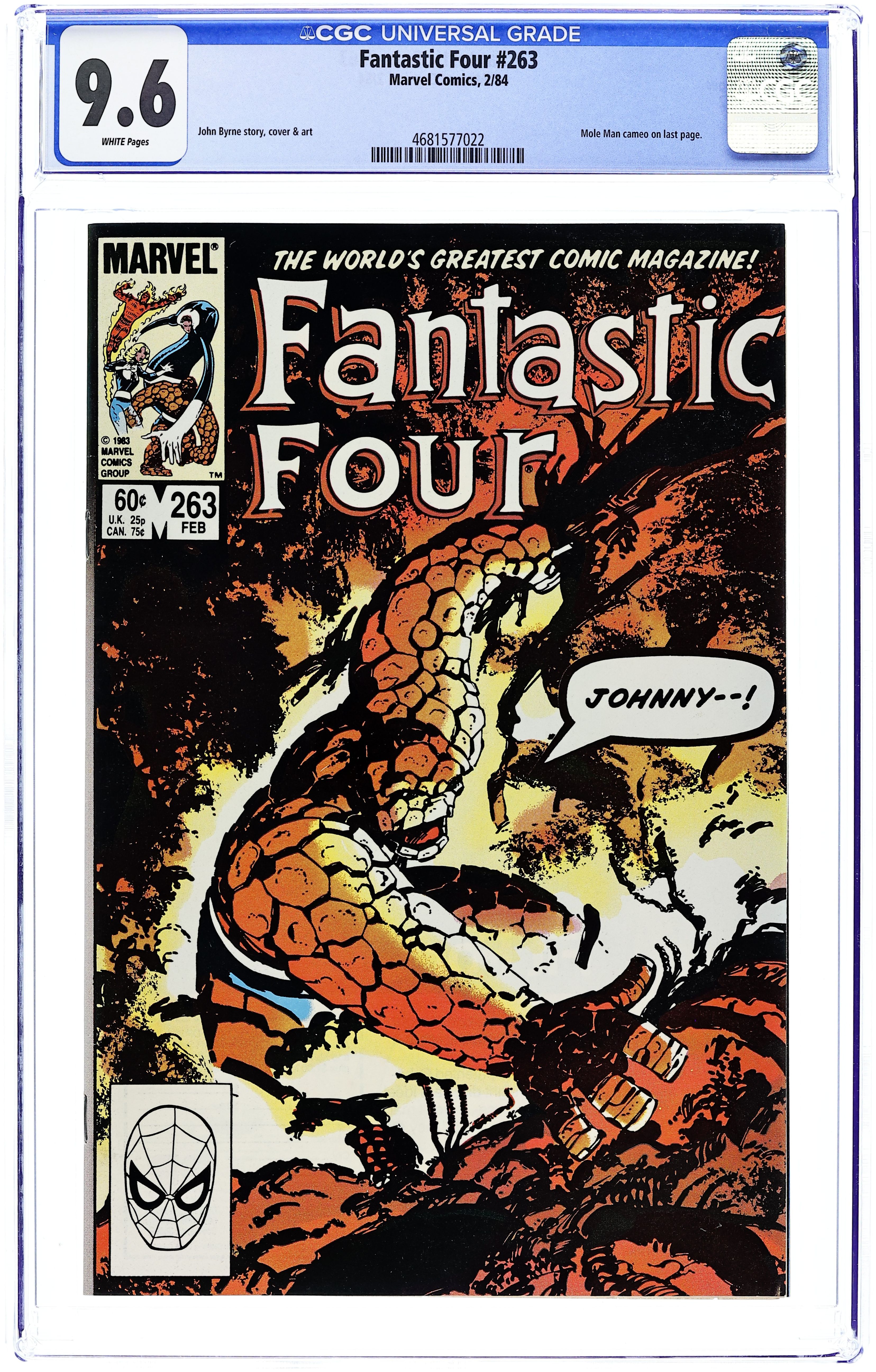 "Trapped!" Part 5 of 9. Guest-starring Daredevil. Story, art, and cover by John Byrne. In the Negative Zone one of the greatest thinkers in the Marvel Universe, Reed Richards, has been rendered mindless. Is this the end of the Fantastic Four? Meanwhile back on Earth, Annihilus makes his move, and the Man without Fear makes a startling discovery. Story continues in Avengers (Vol. 1) #233. 36 pgs. Cover price $0.60.