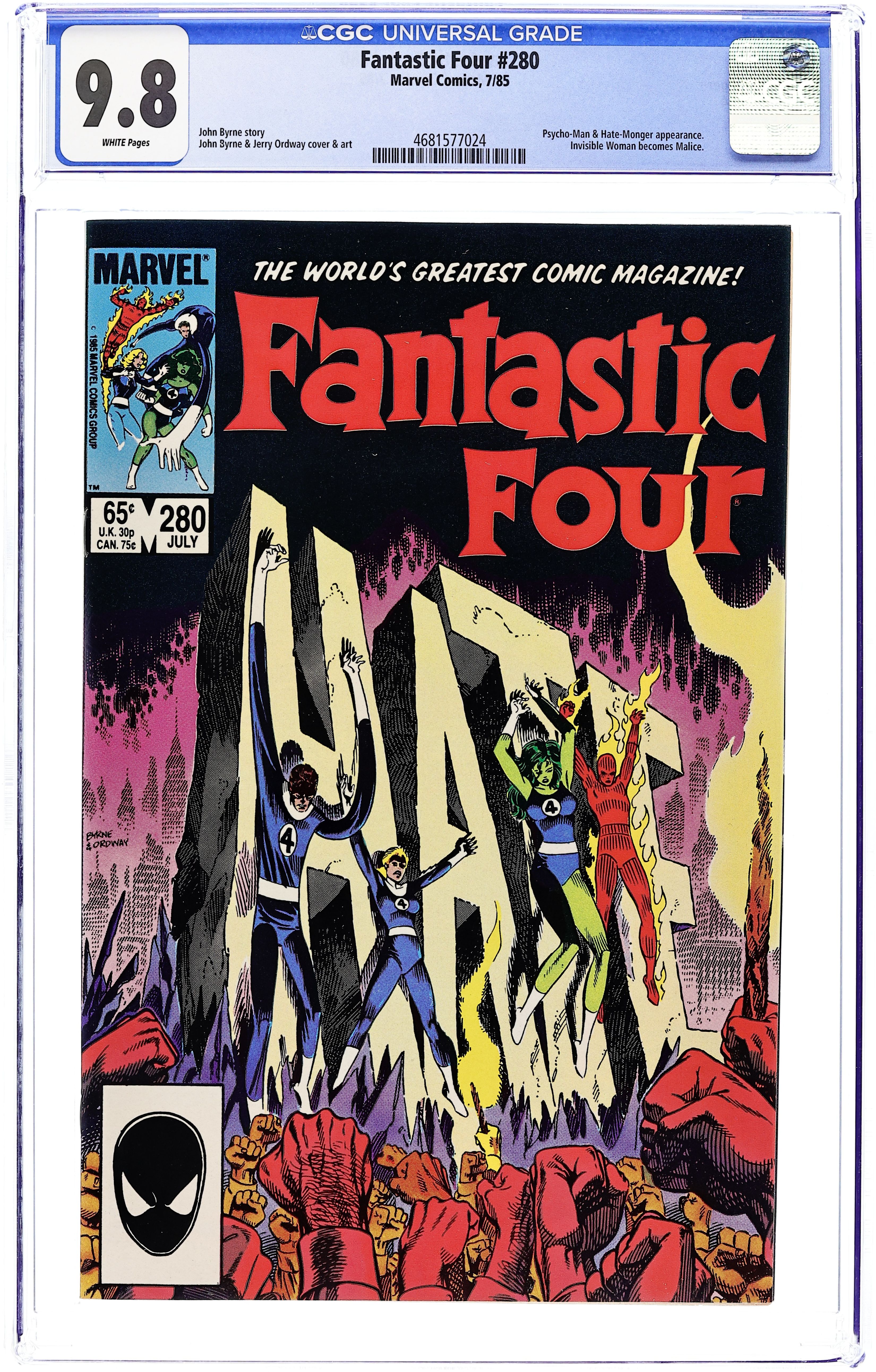 Direct Edition. "Tell Them all They Love must Die...!" Part 1 of 3. Guest-starring Wyatt Wingfoot. Story by John Byrne. Art by John Byrne and Jerry Ordway. Cover by John Byrne. Something, or someone, is causing the populace of New York City to become consumed by unadulterated hate. Can the Fantastic Four find the source of this upheaval before it's too late. Who is this mysterious villainess that has just thrashed the She-Hulk? The answer will shock the Fantastic Four to their very core. Don't miss the unprecedented debut of Malice (1st appearance)! Cover price $0.65.
