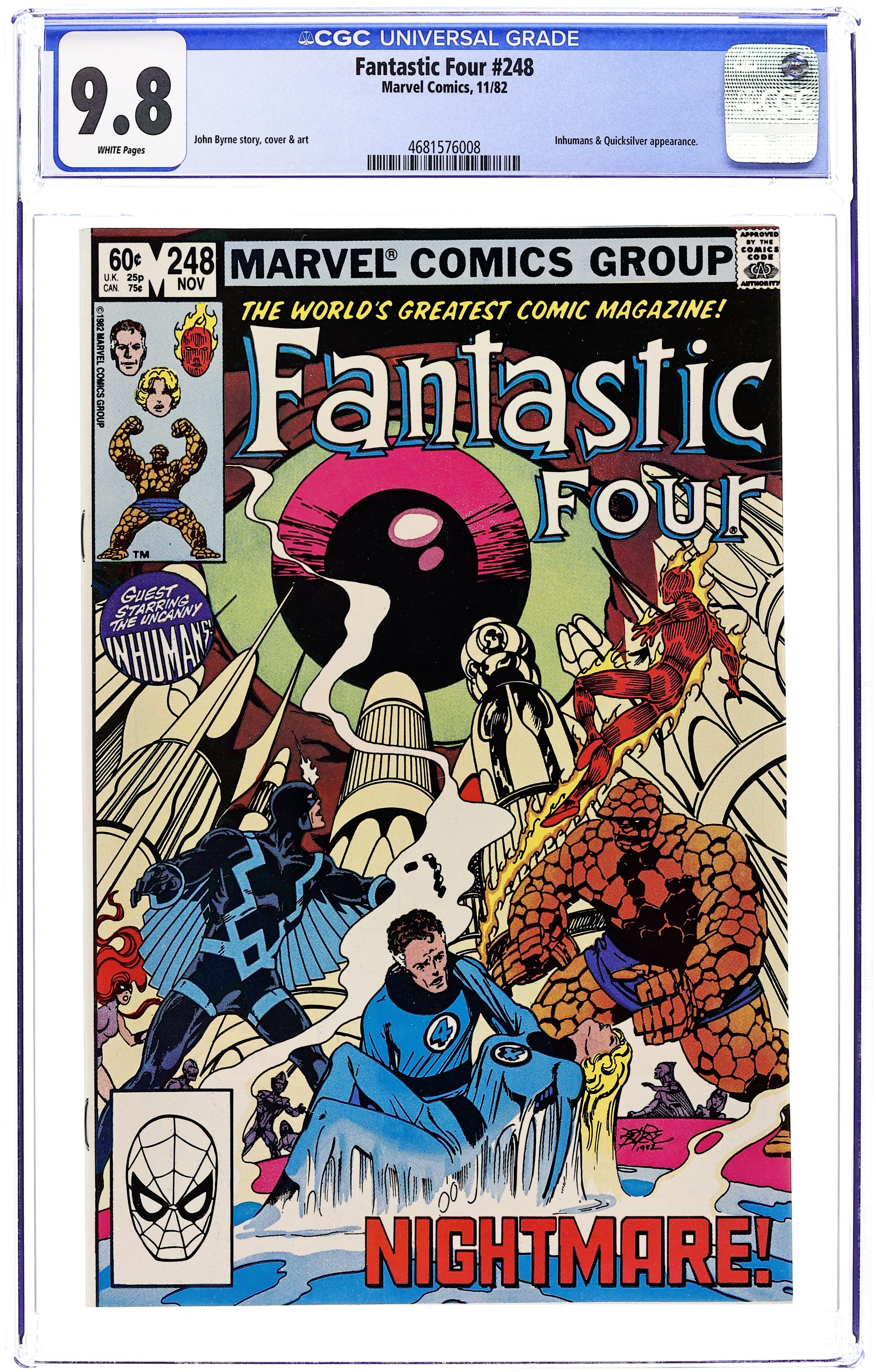 "Nightmare!" Guest-starring the Inhumans. Script and Art by John Byrne. Cover by John Byrne. The fabulous foursome travel to the Blue Area of the moon to visit their friends, the Inhumans. In a special ceremony, the daughter of Pietro and Crystal is set to be officially named! But before the joyous event can take place, each member of the FF and the Inhumans is caught in his or hers nightmare reality! The amphibious Inhuman, Triton, holds the key to survival! 36 pages Cover price $0.60.