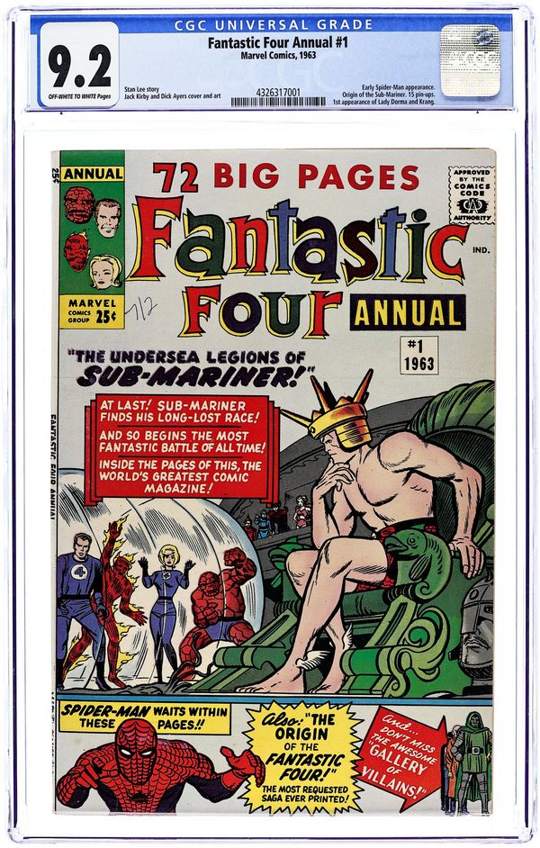 New Sub-Mariner/FF story: "Sub-Mariner Versus the Human Race!" Script by Stan Lee; pencils by Jack Kirby; inks by Dick Ayers. New Spider-Man/FF story: "The Fabulous Fantastic Four Meet Spider-Man!" Script by Stan Lee; pencils by Kirby; inks by Steve Ditko. Fourteen pages new pin-ups and special features by Kirby/Sol Brodsky. Thirteen-page Fantastic Four origin reprinted from FF #1 76 pgs. Cover price $0.25.