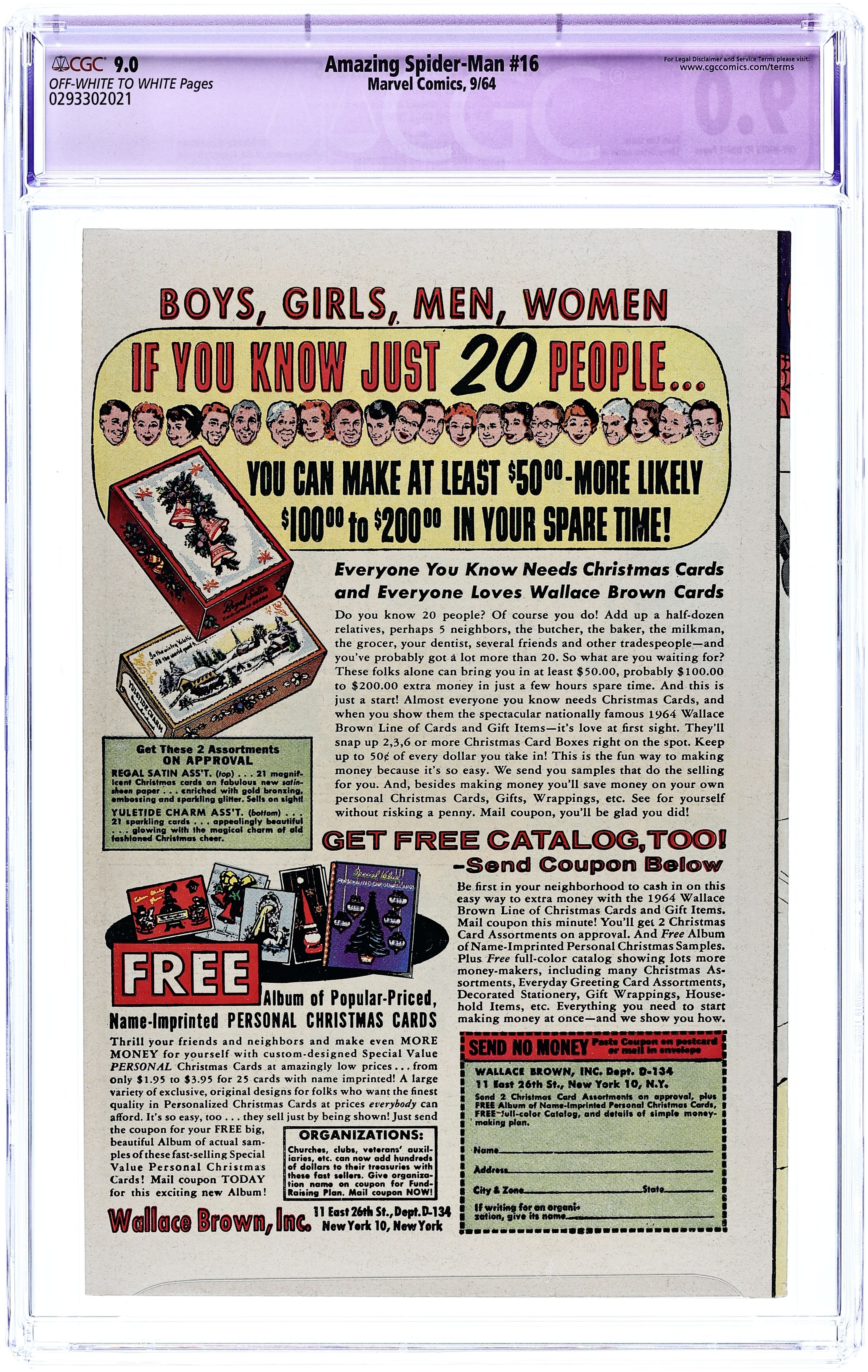 Cover art by Steve Ditko. Third appearance of the Sandman in The End of Spider-Man!, script by Stan Lee, art by Steve Ditko; With the entire city thinking he is a coward, Spider-Man runs from Sandman; Peter's life is in shambles, and he contemplates giving up being Spider-Man to concentrate on his personal life; Cameos by the Avengers, Daredevil, the Fantastic Four, the Green Goblin, Kraven the Hunter, Doctor Octopus, and the Vulture. First appearance of Ned Leeds (later Hobgoblin). Reprinted in Marvel Tales # 13 and 156. Letter to the editor from comics artist Frank Brunner. 36 pgs. $0.12. Cover price $0.12.