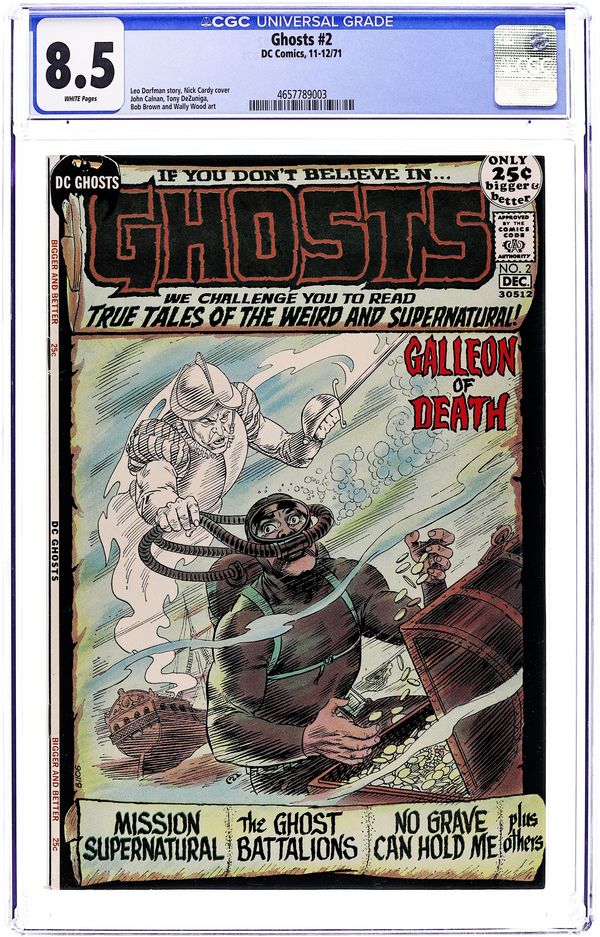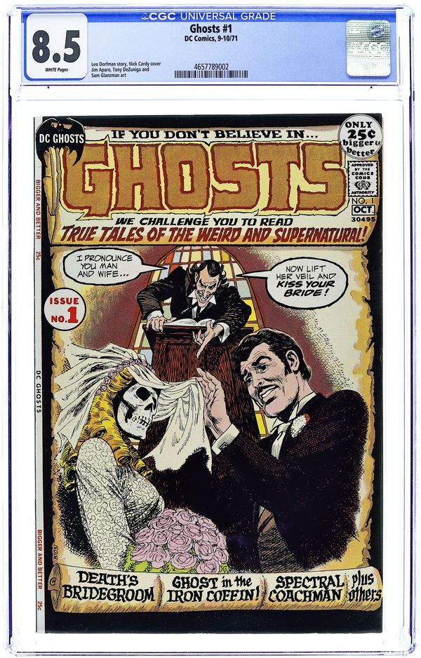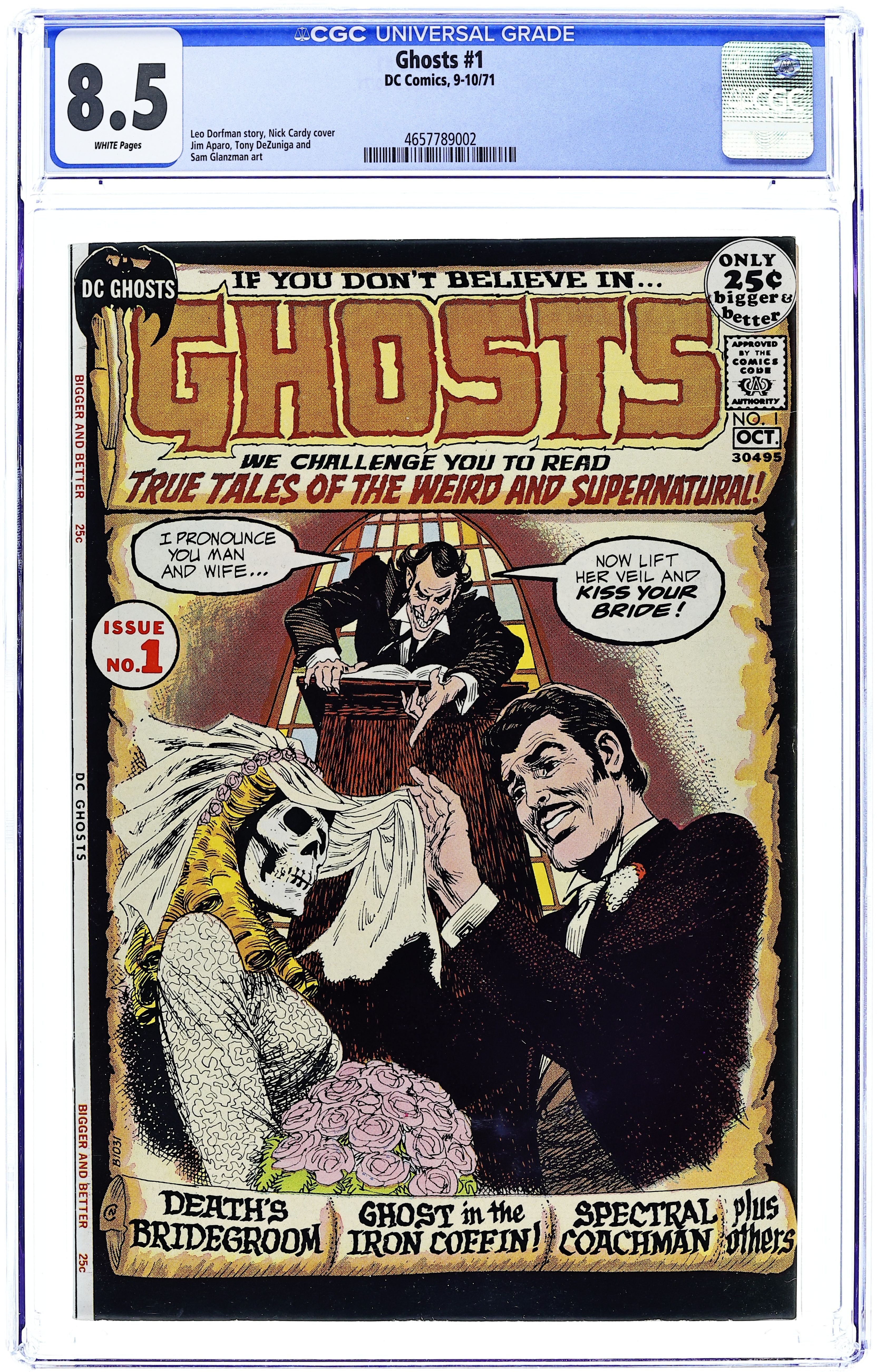 Cover by Nick Cardy. Stories by Carl Wessler and unknown. Art by Fred Carrillo, Gerry Talaoc, J. Noriega, Sam Glanzman and Alfredo Alcala. If you don't believe in ghosts...we challenge you to read true tales of the weird and supernatural! In this issue: "Dead Is My Darling!" with art by Fred Carrillo; "The Spectral Avenger" with art by Gerry Talaoc; Tales of the Haunted and the Damned! story "The Most Haunted House in England!" by Carl Wessler, J. Noriega and Alfredo Alcala; "The Jinx That Rode the Skies" with art by Sam Glanzman; and 1-page text story "Our Son, the Spectre"! 32 pages, full color. Cover price $0.20.