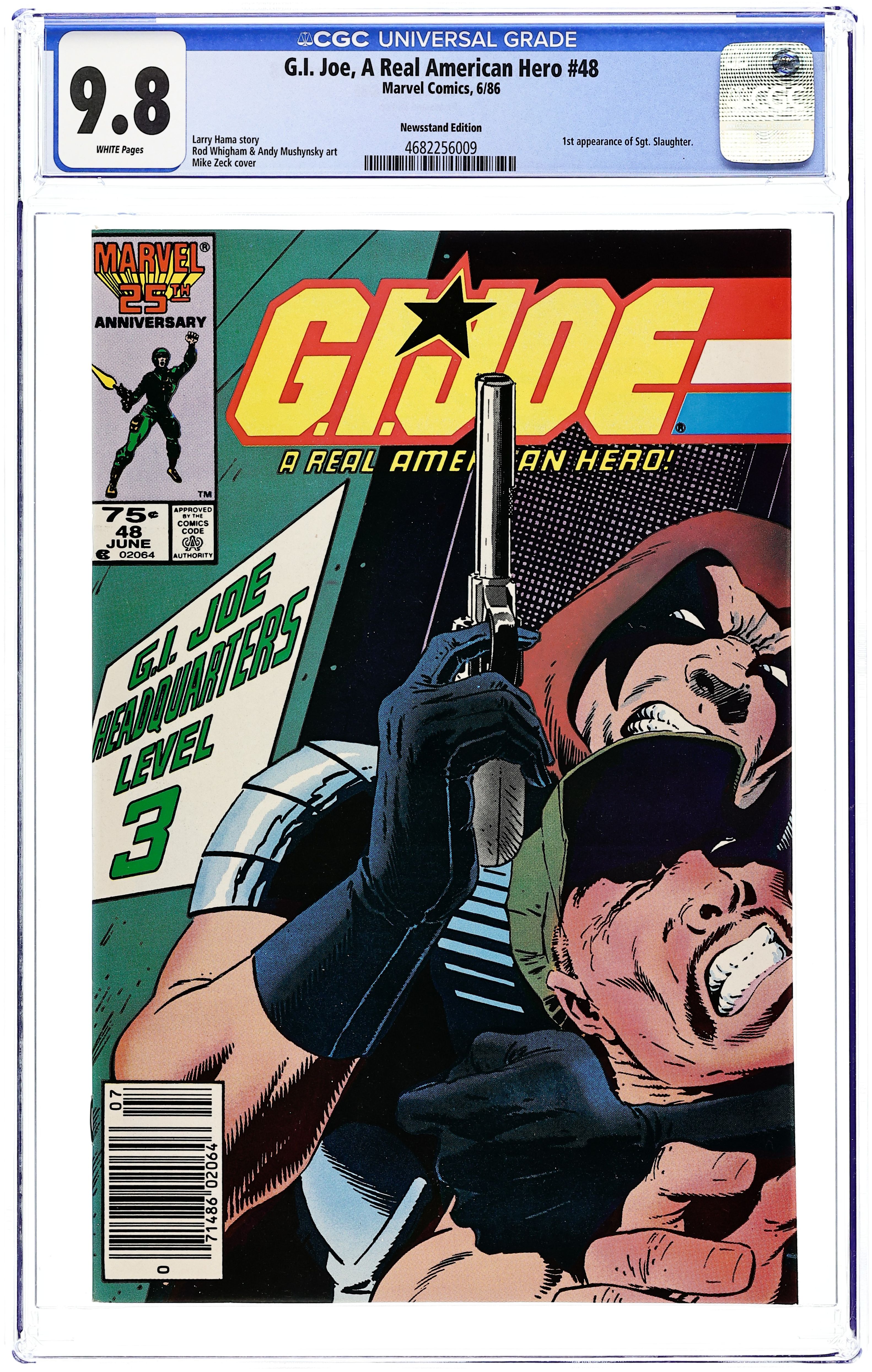Newsstand Edition. 1st printing - Marvel 25th Anniversary Edition Cover Featuring Snake-Eyes -"Pit-Fall!" Written by Larry Hama. Art by Rod Whigham and Andy Mushynsky. Cover by Mike Zeck. Cobra attacks on GI Joe's home turf! 32 pages, FC. Cover price $0.75.