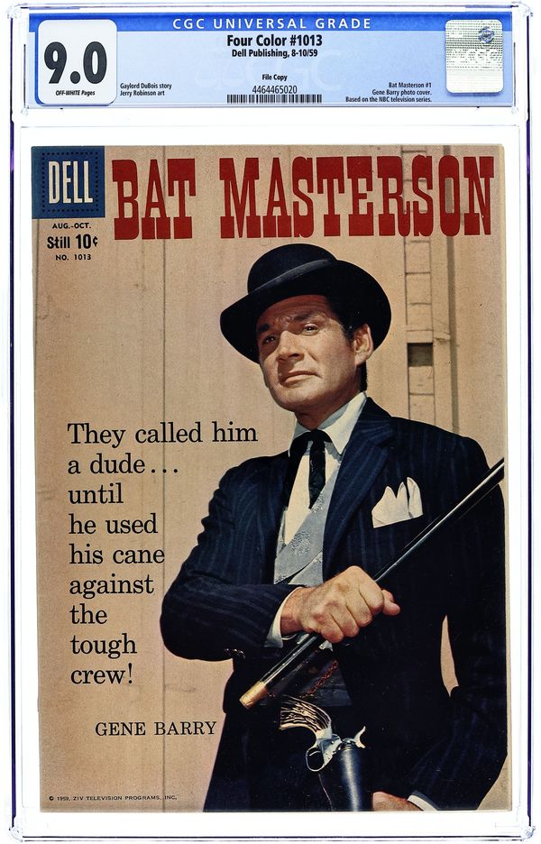 Indicia title is "BAT MASTERSON, No. 1013." Based on the "Bat Masterson" TV series. Photo cover of Bat Masterson (as played by Gene Barry). Preview with photos. The Tough Crew; Bat stops a gang of bullies from harassing an orphan boy; Later the boy tells Bat that the gang is the same one that robbed a railroad payroll and killed his father. The Treasure Hole; June Borden comes west only to find her father murdered in a tussle over a gold nugget. Apache Pass fact page. Tombstone fact page. Scripts by Gaylord Du Bois, art by Jerry Robinson. 36 pages, full color. Cover price $0.10.