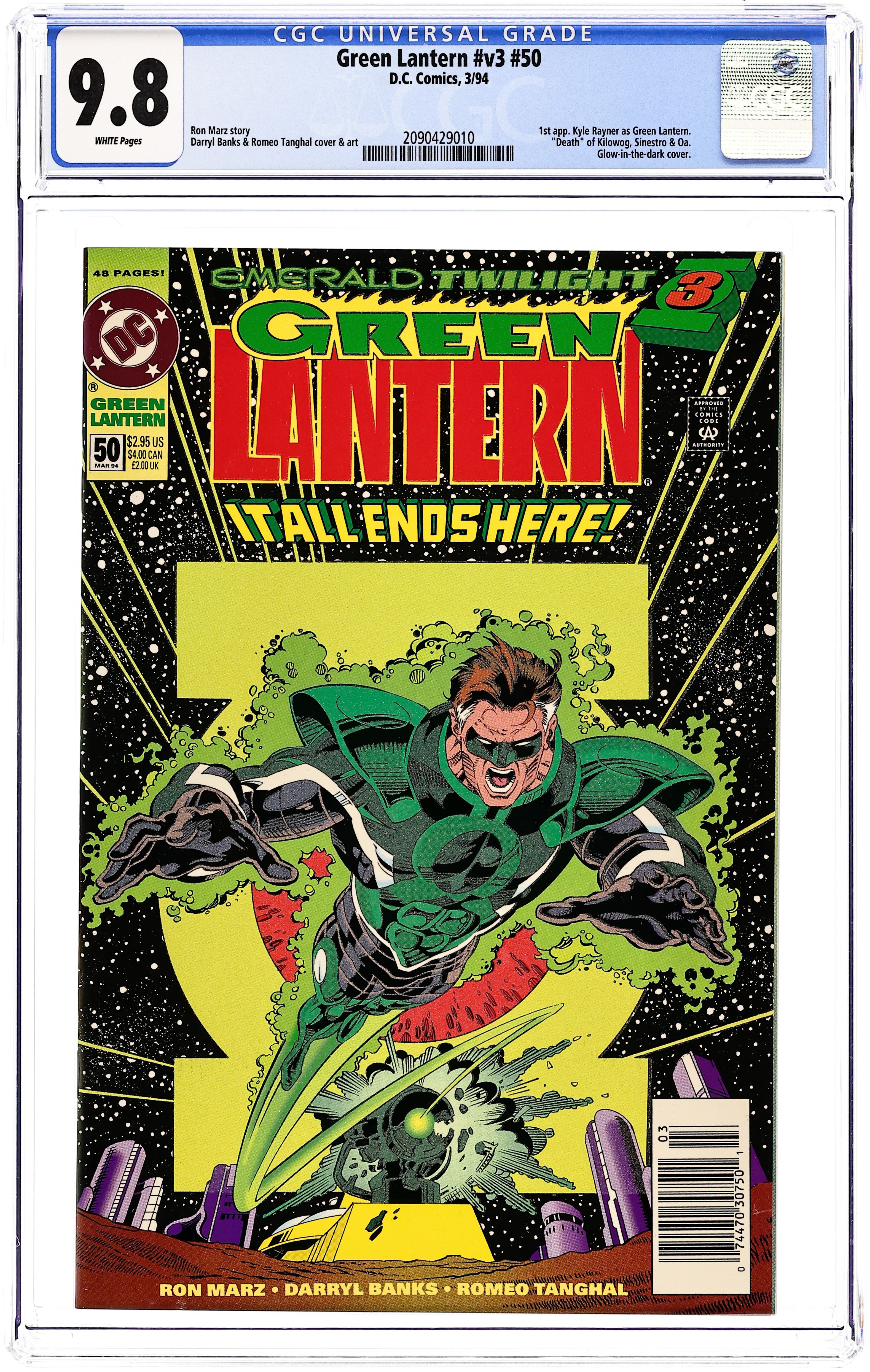 Direct Edition. Emerald Twilight: Part 3 of 3. "The Future!" Story by Ron Marz. Art by Darryl Banks and Romeo Tanghal. Don't miss the most startling conclusion of all. In order to stop a Hal Jordan who has gone mad with grief the Guardians of the Universe have unleashed the diabolical Sinestro, Hal's former mentor and greatest adversary. It's the final showdown - Hal Jordan vs. Sinestro to the death! Plus, the birth of a new hero and a new era in the life of Green Lantern. Things will never be the same again. Includes pin-ups of Green Lantern by Jeff Johnson and Terry Austin; Stuart Immonen and Karl Story; Tom Raney; Joe Phillips; Paul Pelletier and Mark Farmer; and Craig Hamilton. NOTE: 1st appearance of the Parallax and 2nd appearance of Kyle Rayner (1st appearance as Green Lantern). 52-page giant Cover price $2.95.