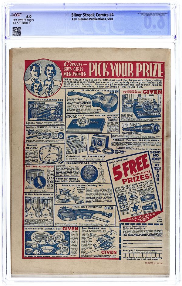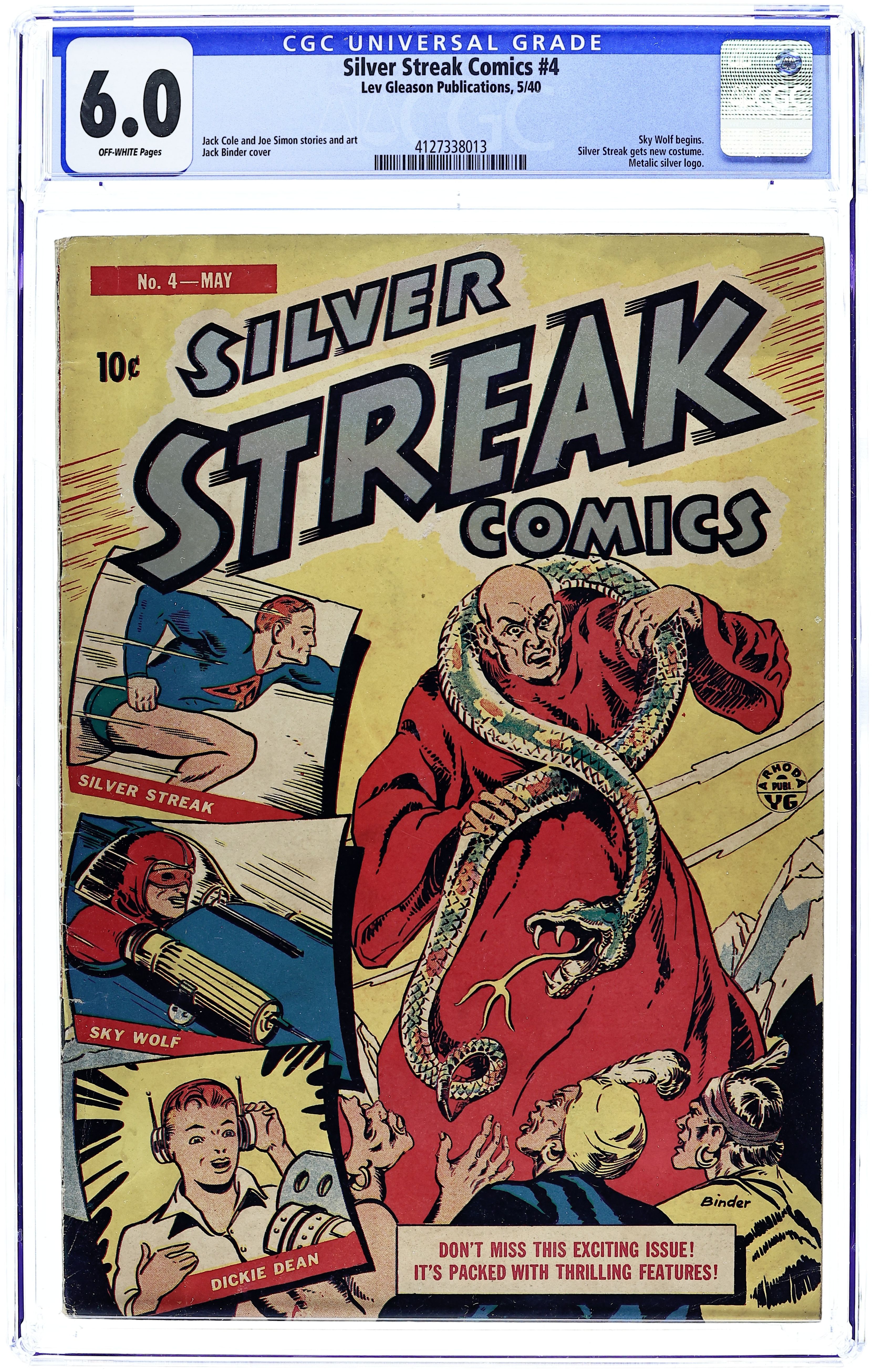 Cover art by Jack Binder. Silver Streak story, script and art by Jack Cole. Bill Wayne story. Lance Hale story with the Lizard Men. Dickie Dean story, script and art by Jack Cole. Ace Powers story with The Panther. Planet Patrol story, script and art by Joe Simon. Range Murder text story by Newton Alfred. Sky Wolf story. $0.10. Cover price $0.10.