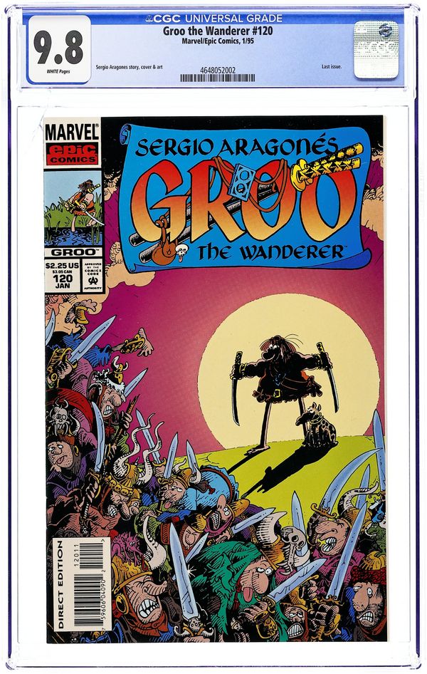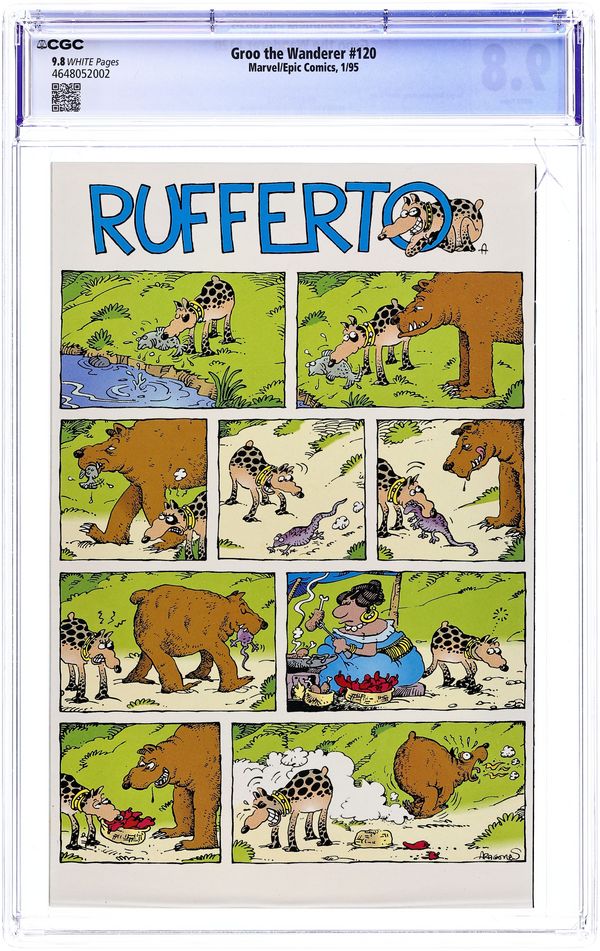 Story by Mark Evanier and Sergio Aragones. Art and cover by Sergio Aragones. Sword and sorcery comedy from Sergio Aragones, as Groo's skill with the sword is only exceeded by his stupidity, making him dangerous to friend and foe alike. The presence of Groo leads to an iron-age arms race, in the last Marvel/Epic issue. Also, a bigger dog keeps taking Rufferto's food; a puzzle page. Final issue of the series; followed by Death of Groo the Wanderer GN (1987 Marvel). The Final Battle; Rufferto. 32 pages, Full Color. Cover price $2.25.