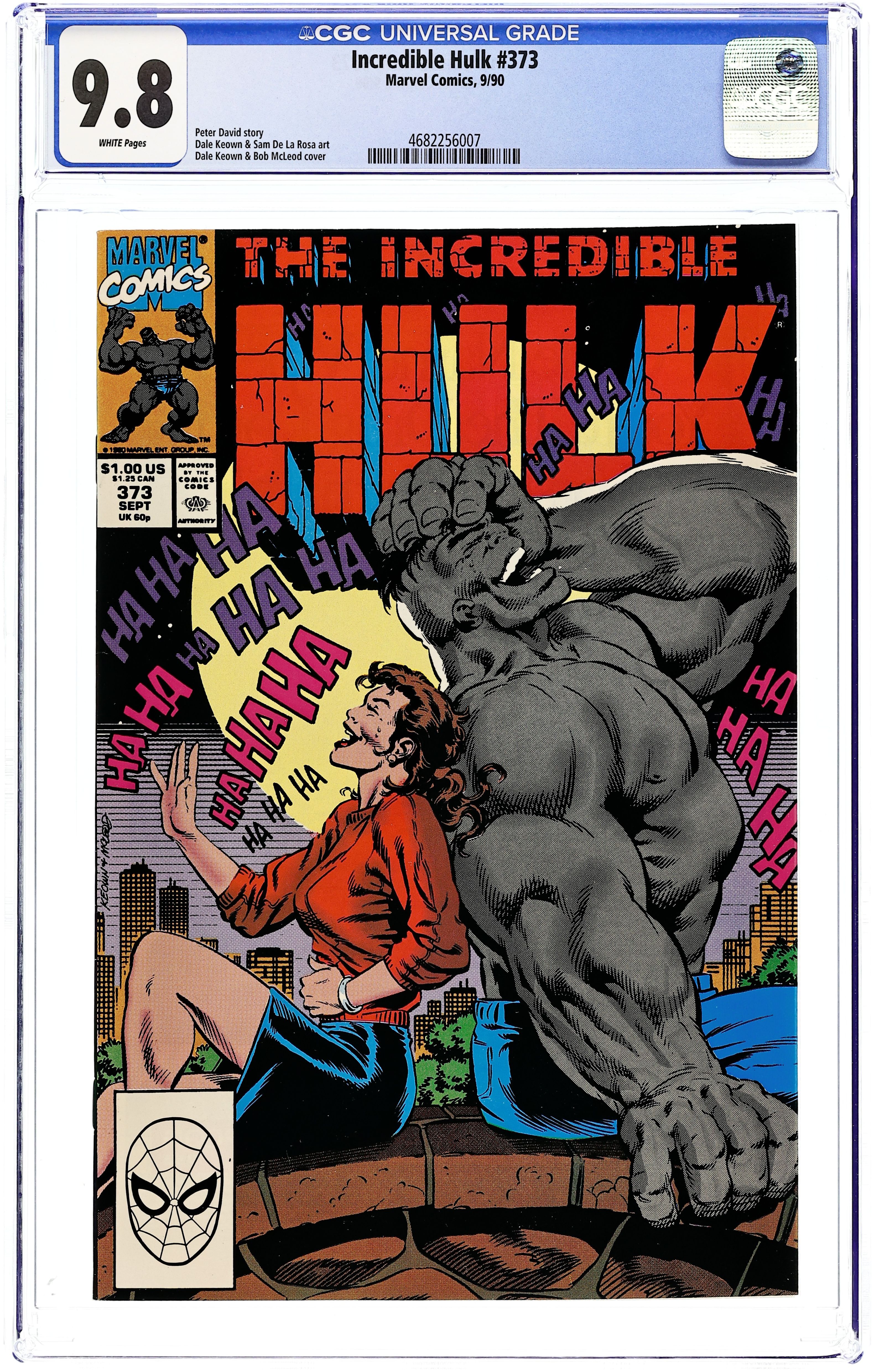 First Printing. Direct Edition. "Honey, I Shrunk the Hulk." Guest-starring Doc Samson. Story by Peter David. Art by Dale Keown and Bob McLeod. Ever wonder why the Hulk is so darn mad all the time? Super psychiatrist Doc Samson sits down with perhaps the most fractured psyche in the world and finds out what makes Bruce Banner tick. Samson, grey Hulk, green Hulk, and Banner delve deep into the scientist's sub-conscious and what they find will shock you. By story's end Bruce Banner and the Hulk will never be the same again. 40 pages. Cover price $1.00.