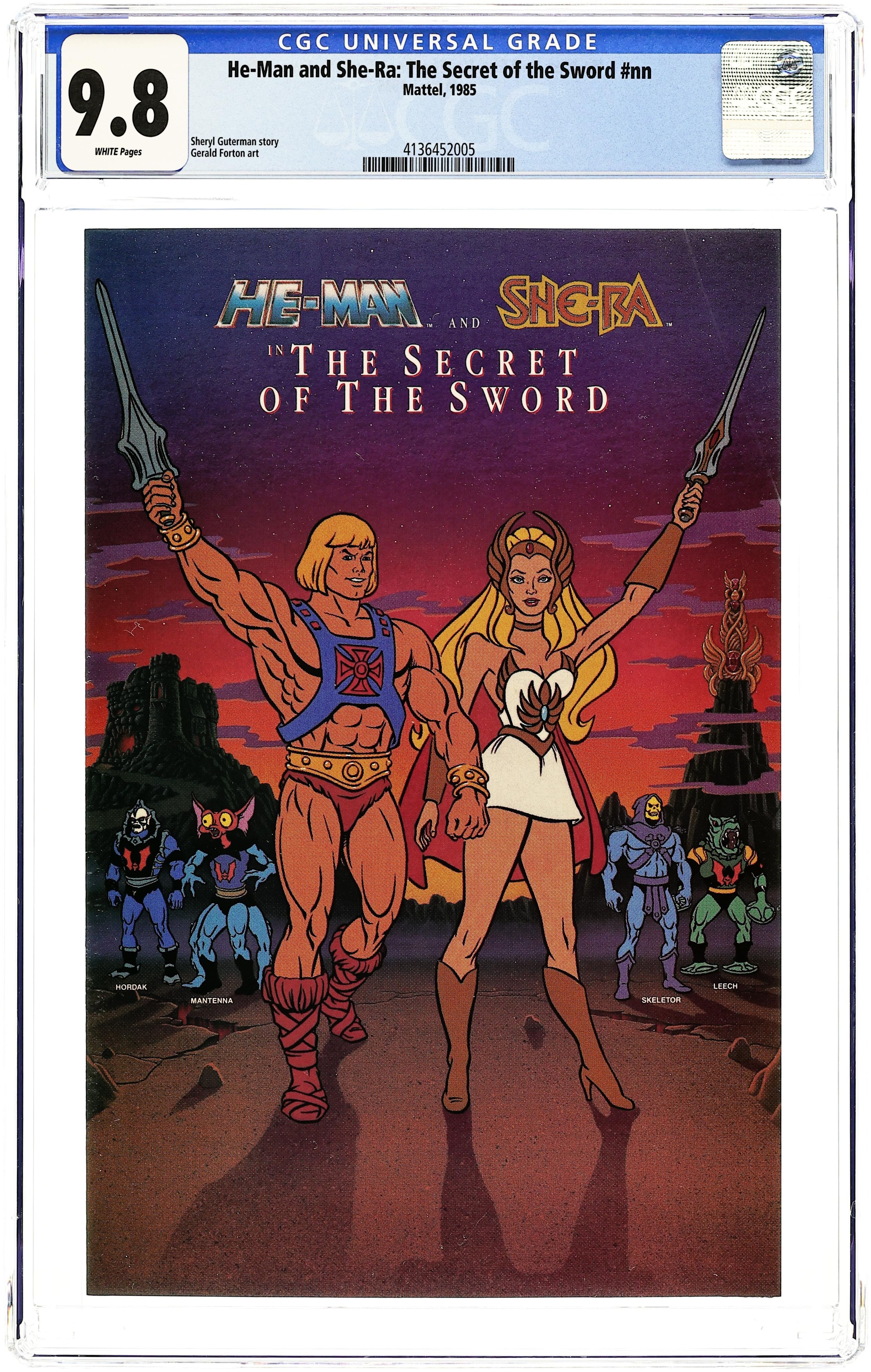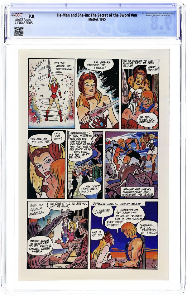He-Man and She-Ra, Secret of the Sword was published in 1985 by Mattel Toys as part of their "The Secret of the Sword Sweepstakes." The inside front cover is the contest entry page. The comic was handed out at movie theaters prior to seeing the movie. The story runs six pages and recaps the movie. Full-color, comic book-sized, 8-pages.