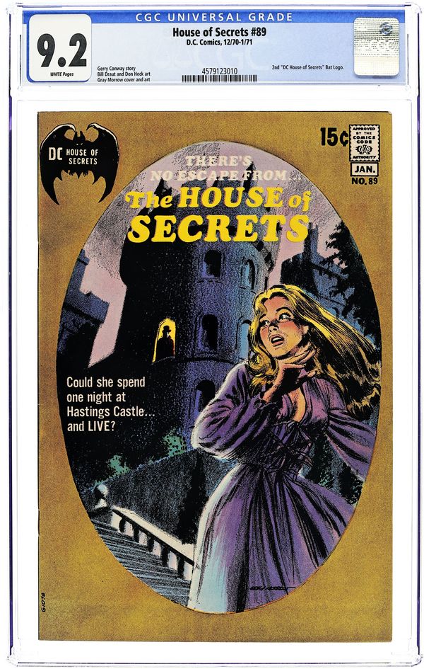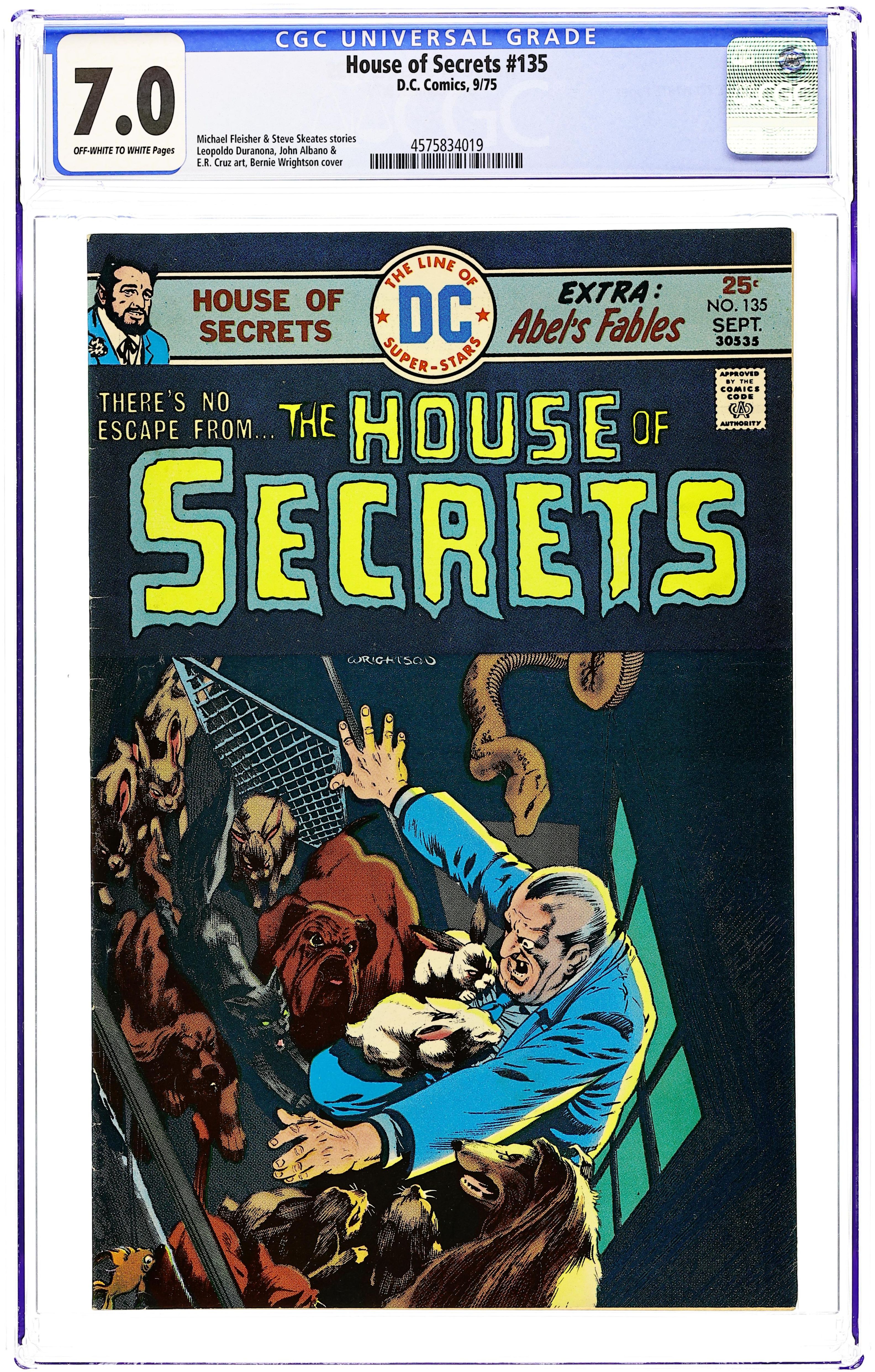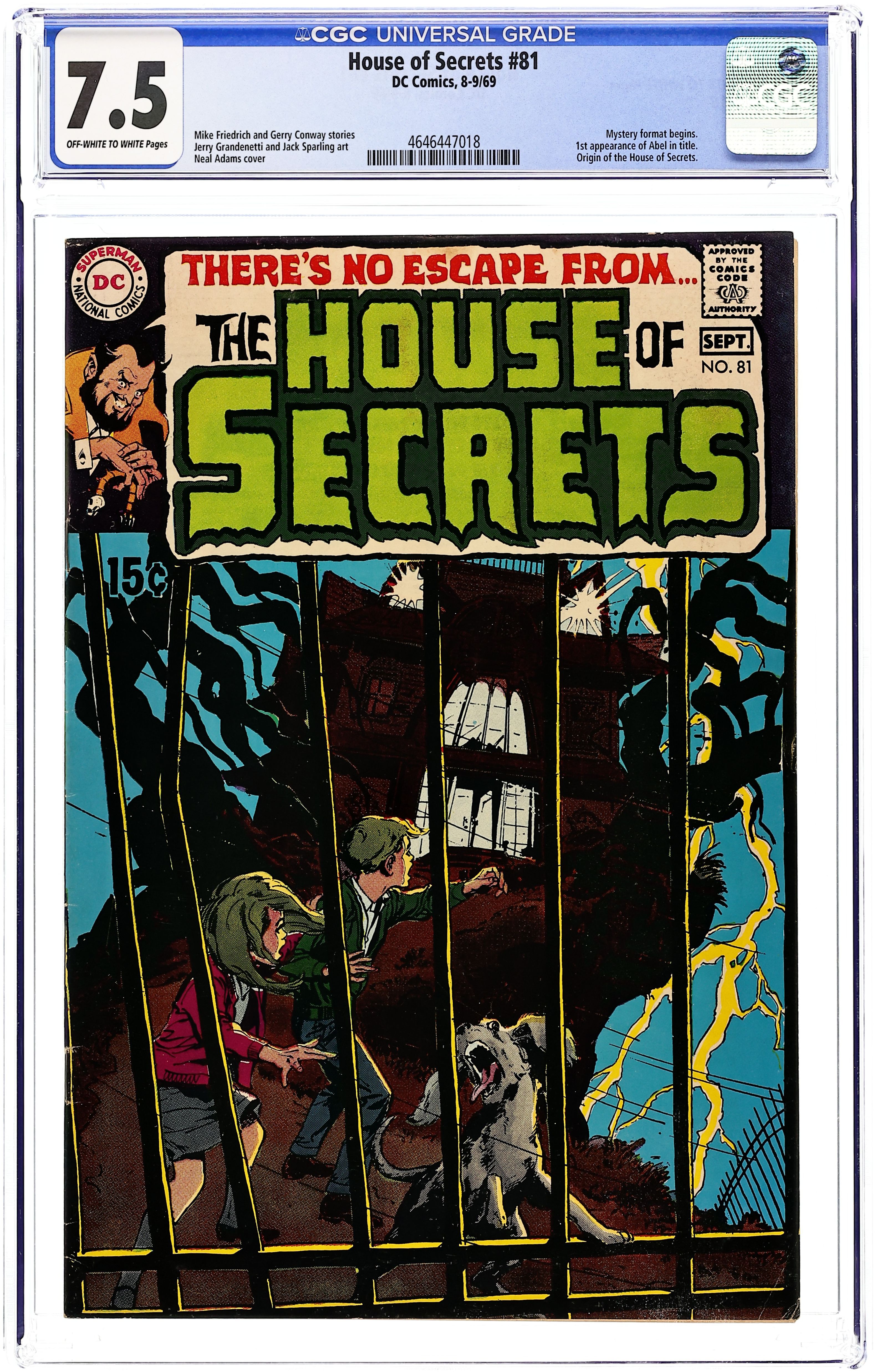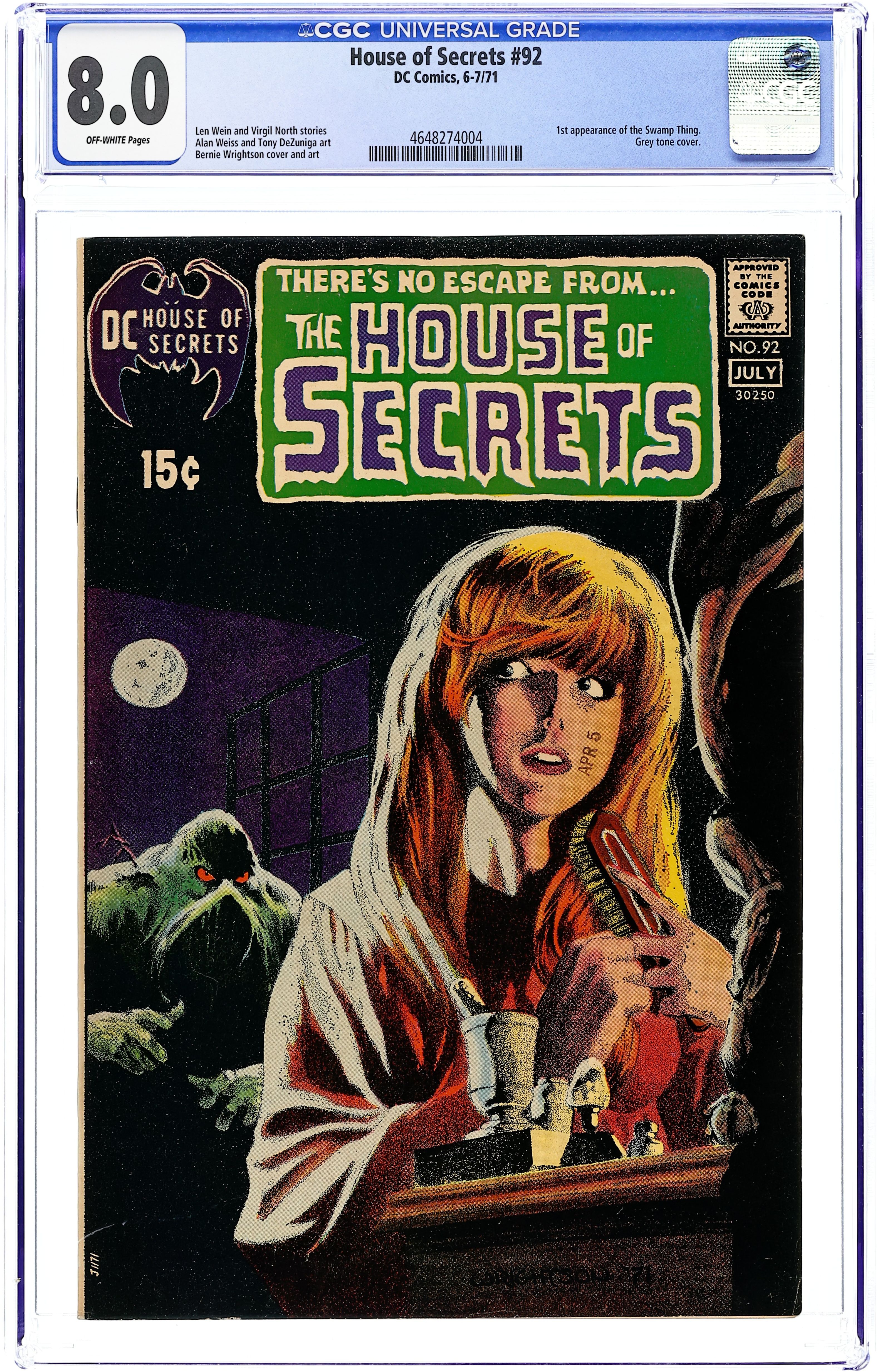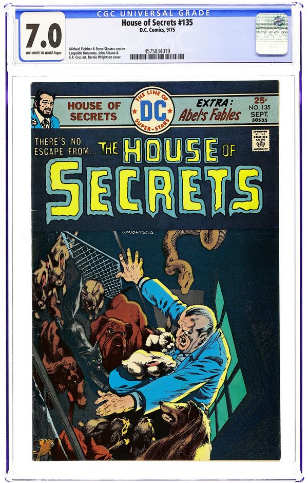 Starts Jan 3 First 15-cent cover. First appearance of Abel. Abel acts as a storyteller and host of the series, as well as the caretaker of the House of Secrets. Cover art by Neal Adams. "Don't Move It!", script by Mike Friedrich, pencils by Jerry Grandenetti, inks by George Roussos; This story provides the background of the House of Secrets, who built it and its history, and leads into the next story which talks about Abel's taking possession of it. "House of Secrets," art by Bill Draut; A realty agent helps Abel move into the House of Secrets where Abel bumps into Cain; When Cain asks Abel who he is talking to, Abel indicates the realty agent who dissipates into a spirit which merges into the House of Secrets. "Burn This House!" text story. "Aaron Philips' Photo Finish!", script by Gerry Conway, art by Jack Sparling; Abel tells Cain a story about a photographer who takes blackmail photos being sent out to photograph the House of Secrets, but the house swallows him up, leaving only a photograph of the man's shocked expression as the only evidence he was ever inside. 36 Pages, Full Color. Cover price $0.15.