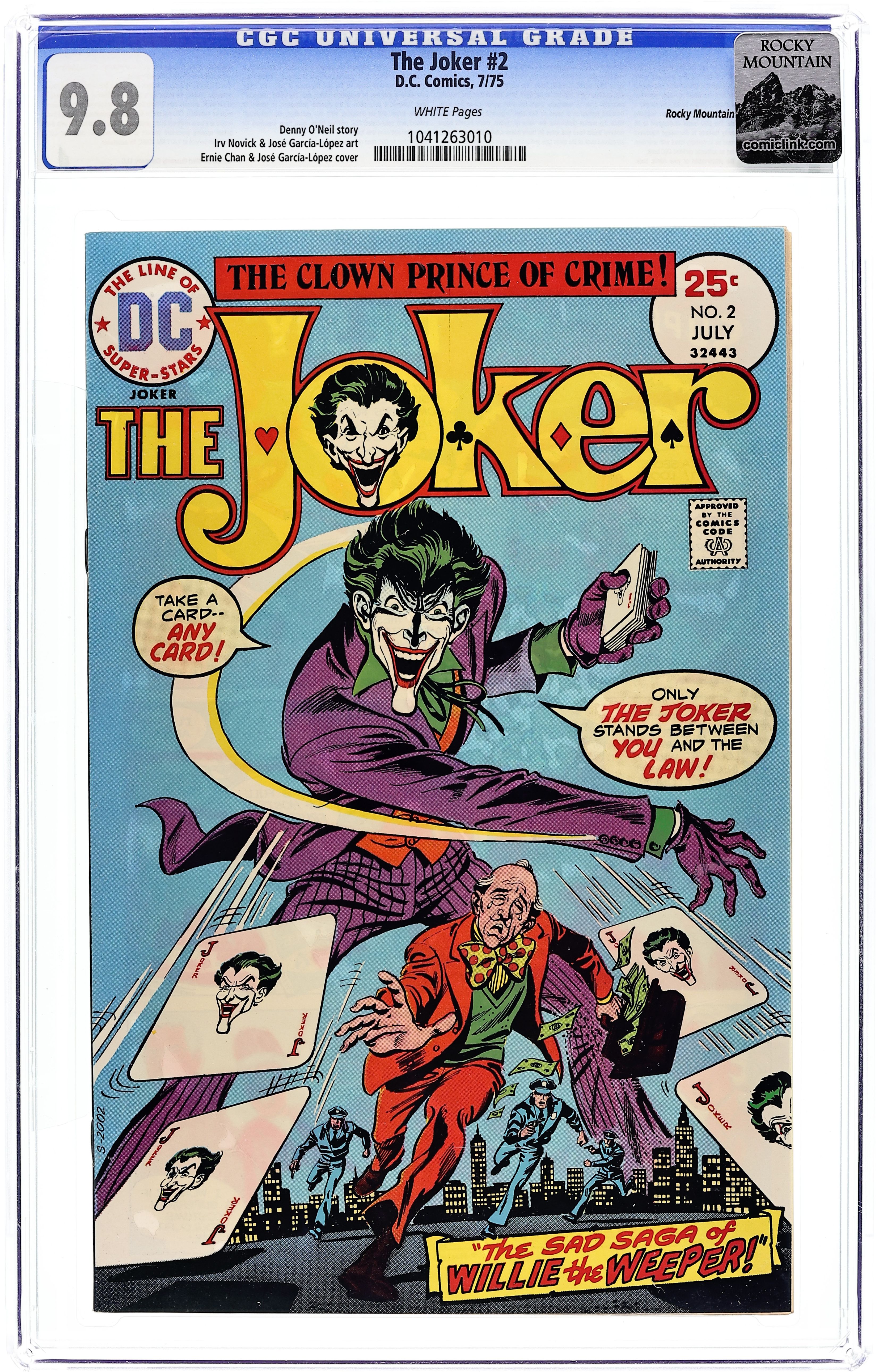 Cover pencils by Ernie Chan, inks by Jose Luis Garcia-Lopez. "The Sad Saga of Willy the Weeper!," script by Denny O'Neil, pencils by Irv Novick, inks by Jose Luis Garcia-Lopez; The Joker teams up with Willie the Weeper when Willie breaks him out of Arkham; The Joker then helps him steal platinum but is thwarted by Gordon. Superman ad. 1 page Joker text article "The Wildest Card, Part 2," about the history of the Joker. 36 pgs., full color. $0.25. Cover price $0.25.
