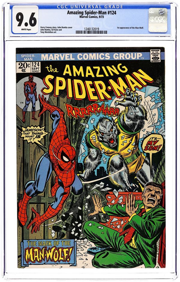 First appearance of the Man-Wolf (aka John Jameson) in "The Mark of the Man-Wolf" Part 1 of 2. Script by Gerry Conway. Pencils by Gil Kane. Inks by John Romita and Tony Mortellaro (backgrounds). Cover by John Romita. While web-swinging through the city, Spider-Man stops to look at the local newspapers. He becomes angry when the Daily Bugle is the only newspaper calling him a murderer -- in connection with the death of Norman Osborn! The livid wall-crawler rushes to JJJ's apartment, but someone else gets their first: the Man-Wolf! Oh my! As shown on the terrific cover, Spider-Man battles the Man-Wolf to save J. Jonah Jameson! First appearance of Kristine Saunders. Cameo appearances by Mary Jane Watson, Flash Thompson, and Joe Robertson. (Notes: In the letters page, the web-slinger's fans react to Gwen Stacy's death. This story was reprinted in Marvel Tales 101.) 36 pages. Cover price $0.20.