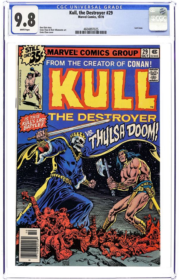 To Sit the Topaz Throne! - Written by Don Glut. Art by Ernie Chan and Ricardo Villamonte. Cover by Ernie Chan. Is this Kull's last battle? Don't miss Kull the Destroyer taking on Thulsa Doom in this epic final issue! Also: Letters page note by Roy Thomas. 32 pages, full color. Cover price $0.35.