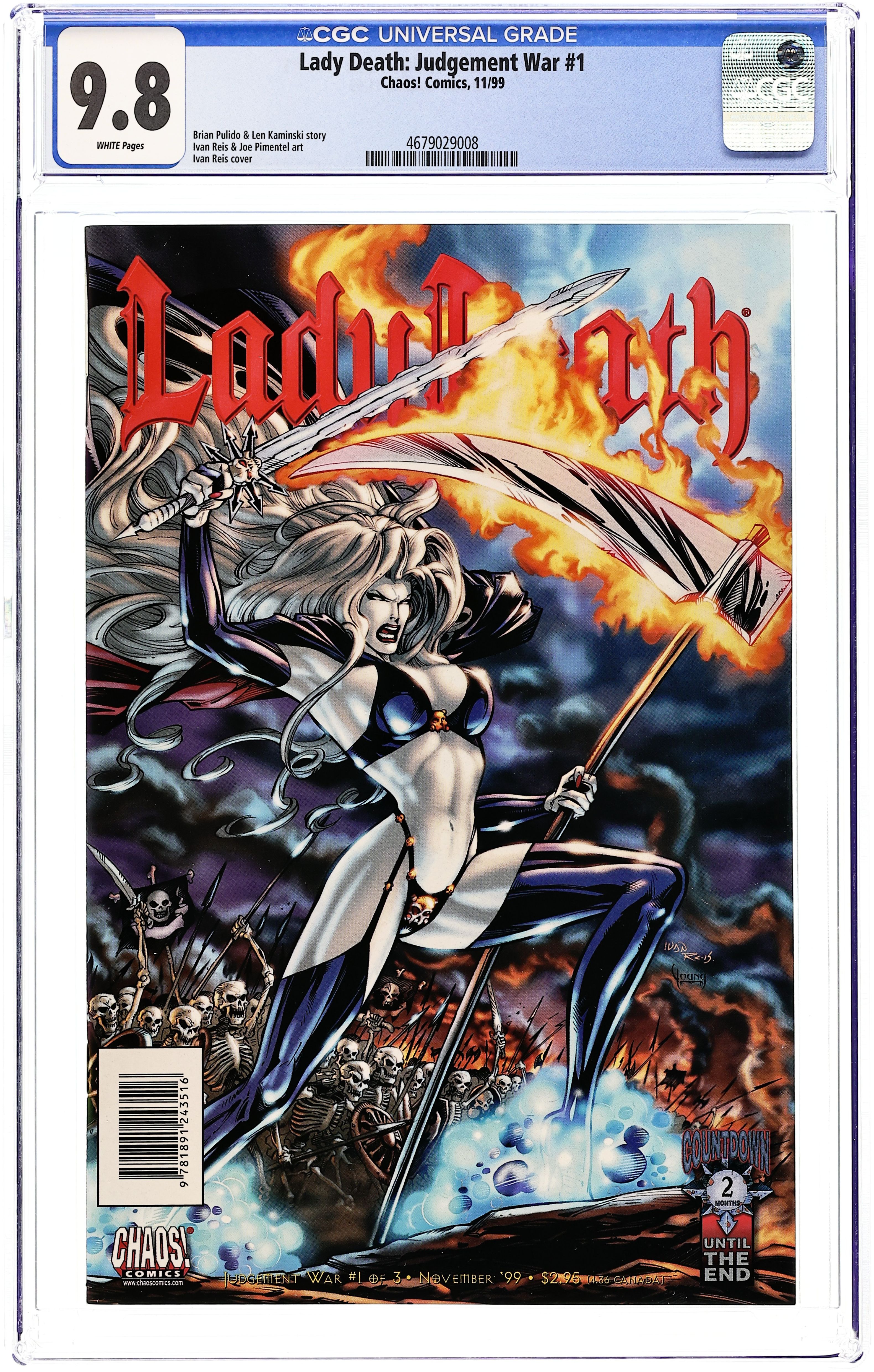 Chromium Gold Foil Embossed cover. Lady Death is trapped in the void between worlds by Pagan, the insidious court jester of Hell. "Crossroads" written by Brian Pulido, art by Steven Hughes, colors by Jason Jenson. Cover price $3.50.
