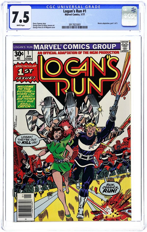 Cover by George Perez and Al Milgrom. "Logan's Run, Part 1". Part 1 of 5. Story by Gerry Conway (from the screenplay by David Zelag Goodman which was based on the novel by George Clayton Johnson and William F. Nolan). Pencils by George Perez. Inks by Klaus Janson. Welcome to the 23rd century, where life is perfect. There's just one catch. At birth everyone is implanted with a life jewel in their palm. When they reach the age of thirty, the jewel informs them they must report for termination. Not everyone accepts this however. Some choose to run. That's where Logan comes in. Logan is a Sandman, charged with terminating those who do not submit willingly. Everything changes when Logan meets Jessica and learns the secret of the Ankh she wears. This leads him to be assigned to find Sanctuary, the destination of all runners. To accomplish this task, he must become a runner himself. 32 pages. Full color. Cover price $0.30.