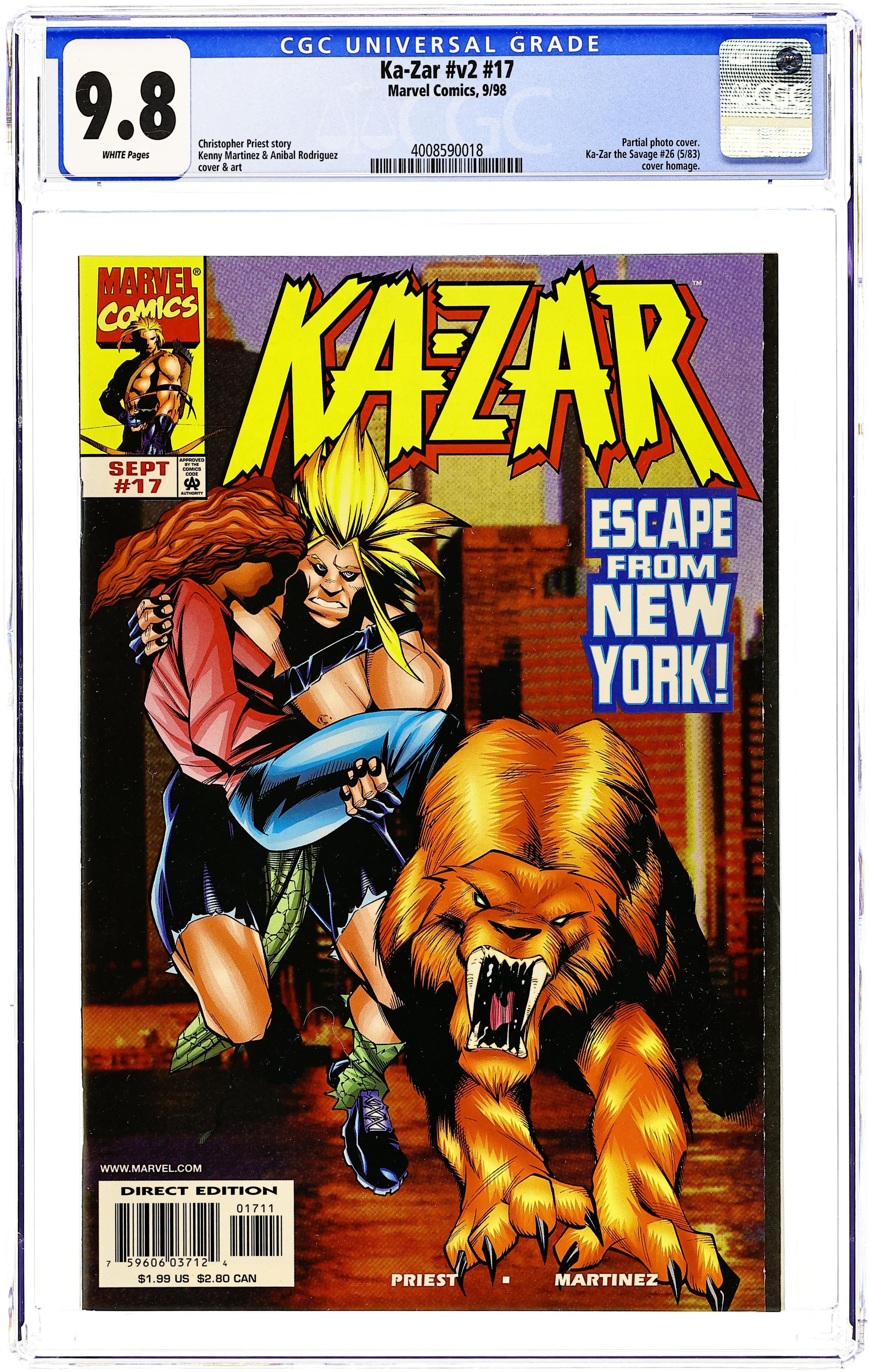 Cover pencils by Kenny Martinez (with photo background), inks by Anibal Rodriguez. Misery, script by Christopher Priest, pencils by Kenny Martinez, inks by Anibal Rodriguez; Ka-Zar, cleared of the charges against him, seeks help from the Black Panther to return to the Savage Land. 36 pgs. $1.99. Cover price $1.99.