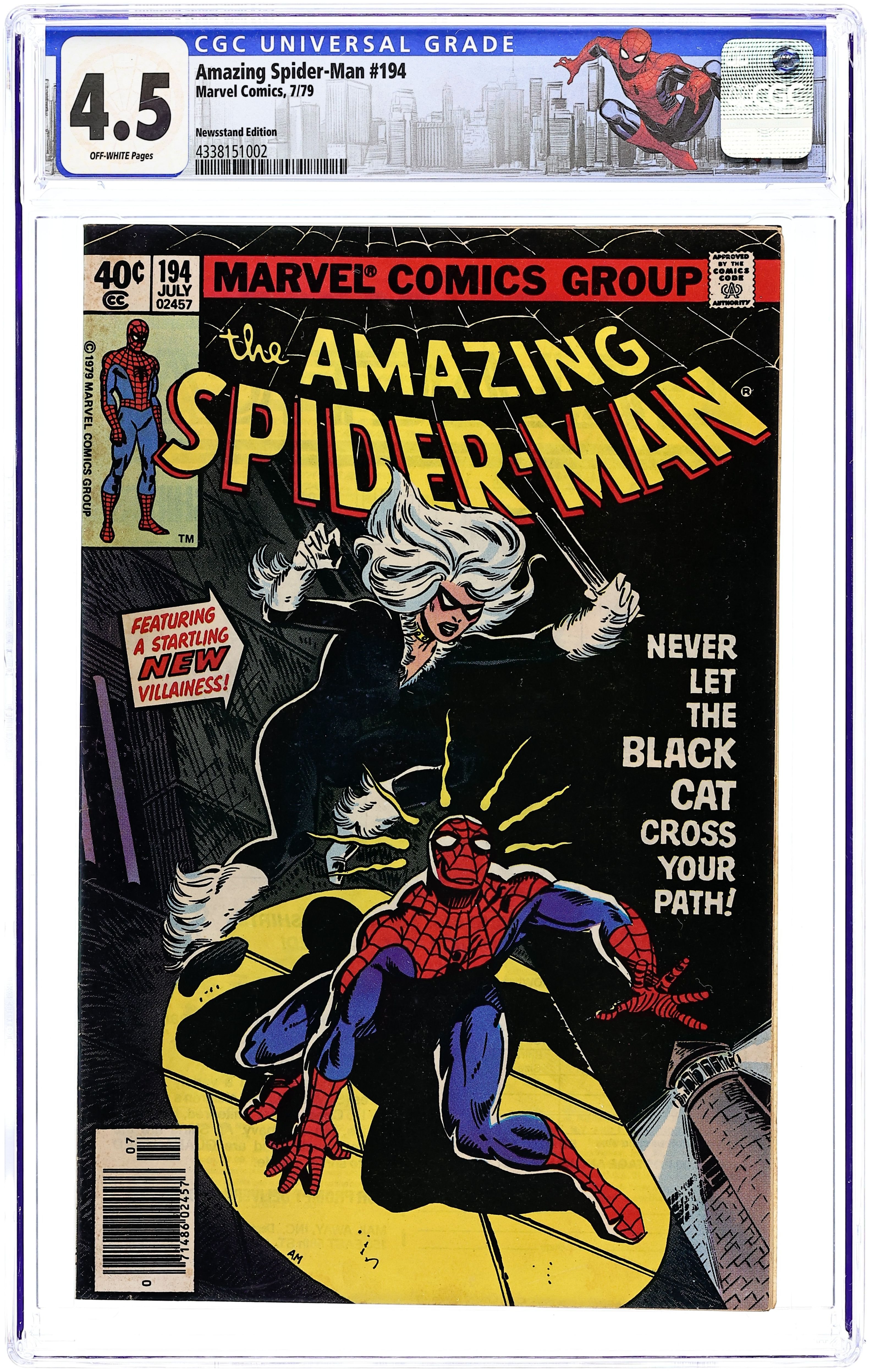 Direct Edition. First appearance of the Black Cat in "Never Let The Black Cat Cross Your Path!" Part 1 of 2. Script by Marv Wolfman. Art by Keith Pollard (breakdowns) and Frank Giacoia (finishes). Cover by Al Milgrom. One of the landmark issues of the Amazing Spider-Man series! The dazzling debut of the Black Cat! The wall-crawler has spent the first 193 issues of his title chasing super-villains! But tonight he's going to kiss one instead! Wow! Does the web-slinger stand a chance against the beauty and charm of Felicia Hardy? Not when the alluring cat has his tongue! And maybe later his heart! A terrific issue! Cameo appearances by Aunt May, Betty Brant, Ned Leeds, Harry Osborn, Flash Thompson, Mysterio (in civilian clothes), and the burglar. (Notes: The Black Cat is the creative highlight of the Wolfman-Pollard run on the Amazing Spider-Man title. Dave Cockrum designed the cat's costume. The letters page includes an alternate cover (for issue 194) by Keith Pollard. It also includes an alternate cover to Spider-Woman 9 by Carmine Infantino. This two-part story was reprinted in the trade paperback: Spider-Man vs. the Black Cat (2005). 36 pages, full color. Cover price $0.40.
