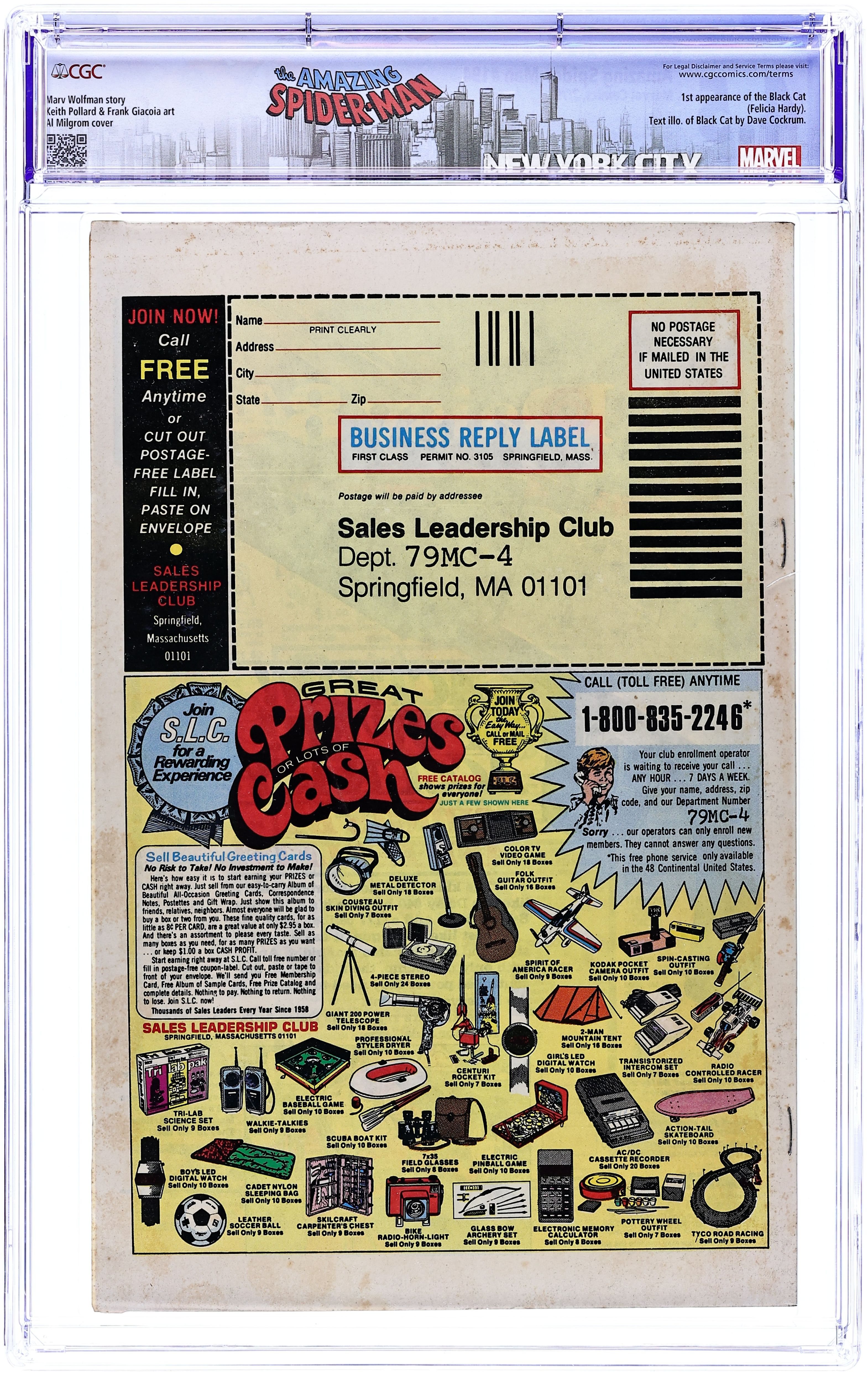 Direct Edition. "Nine Lives of the Black Cat!" Part 2 of 2. Second appearance of the Black Cat. Script by Marv Wolfman. Art by Keith Pollard (breakdowns) and many hands (finishes). Cover by Keith Pollard and Al Milgrom. The Black Cat successfully breaks her father out of prison! And leaves the Spectacular Spider-Man lying in the rubble with a broken arm! What a stroke of bad luck for the web-slinger! However the wondrous wall-crawler is undeterred! And despite his wounded wing, the amazing one tracks down the mischievous cat several hours later! Will Spidey and Felicia end their game of cat & mouse on a friendly note...or a fatal one? Meanwhile, a telegram arrives at Peter Parker's apartment...and with it devastating news for Aunt May's nephew. Brief origin of the Black Cat. Cameo appearances by the Kingpin, Aunt May, Betty Brant, Ned Leeds, Harry Osborn, Flash Thompson, Mysterio (in civilian clothes), and the burglar. (Notes: The Black Cat returns in Amazing Spider-Man 204. The letters page includes a letter from comics historian Peter Sanderson.) 36 pgs. Cover price $0.40.