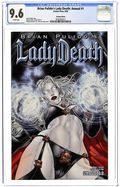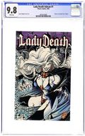 Written by Brian Pulido, Mike MacLean. Art by Diego Bernard. Cover by Mike Krome. Chapter 16 (Part 1) in the Coffin Comics Lady Death Universe. 'World War Death!' official tie-in! Suffering a devastating defeat at the hands of the psychotic Lady Virtue, the diva of death nearly meets a gruesome fate. Only one thing pulls Lady Death back from the edge of oblivion-Vengeance! But how do you defeat an adversary who can steal your very life essence? Can Lady Death and warrior angel Serena finally put a stop to HALO and Matthias? Or will they fall victim to Lady Virtue's twisted desires? 32 pages, full color. Cover price $5.99.