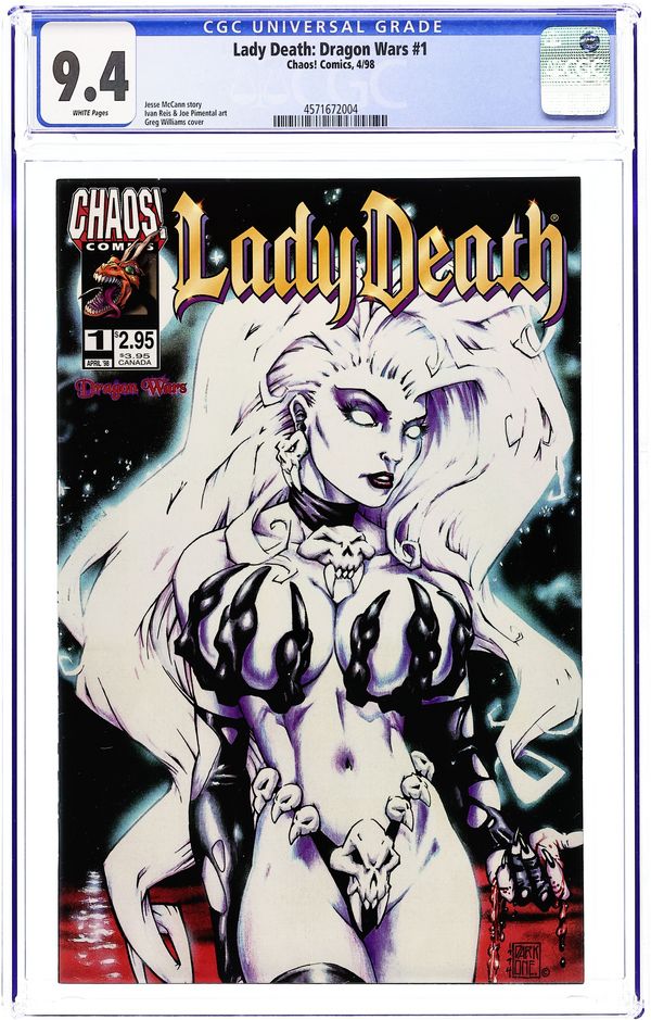 Written by Brian Pulido and Mike MacLean. Art by Diego Bernard. Cover by Elias Chatzoudis. 'Deathocalypse', an official year long company wide event begins here! Caprice's mental manipulations unleashed Lady Death's evil side and New Orleans paid the price in wanton death and destruction. Recovered, Lady Death is now seen worldwide as a villain to be feared and eliminated. Meanwhile, the extinction-level villain Insurrectus and his new mate Atrocity plan to usher in a new horrific age of terror. Can the diva of death overcome this catastrophic crusade she struggles against her own wicked appetites, or are we all doomed once and for all? 32 pages, full color. Cover price $40.00.