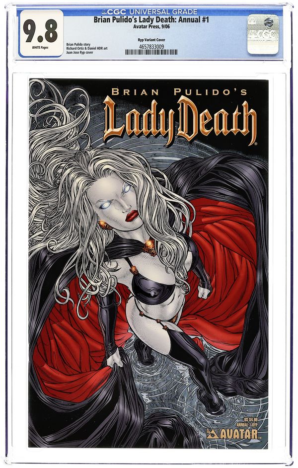 Written by Brian Pulido and Mike MacLean. Art by Diego Bernard. Cover by Anthony Spay. 'Deathocalypse', an official year long company wide event begins here! Caprice's mental manipulations unleashed Lady Death's evil side and New Orleans paid the price in wanton death and destruction. Recovered, Lady Death is now seen worldwide as a villain to be feared and eliminated. Meanwhile, the extinction-level villain Insurrectus and his new mate Atrocity plan to usher in a new horrific age of terror. Can the diva of death overcome this catastrophic crusade she struggles against her own wicked appetites, or are we all doomed once and for all? 32 pages, full color. Cover price $25.00.