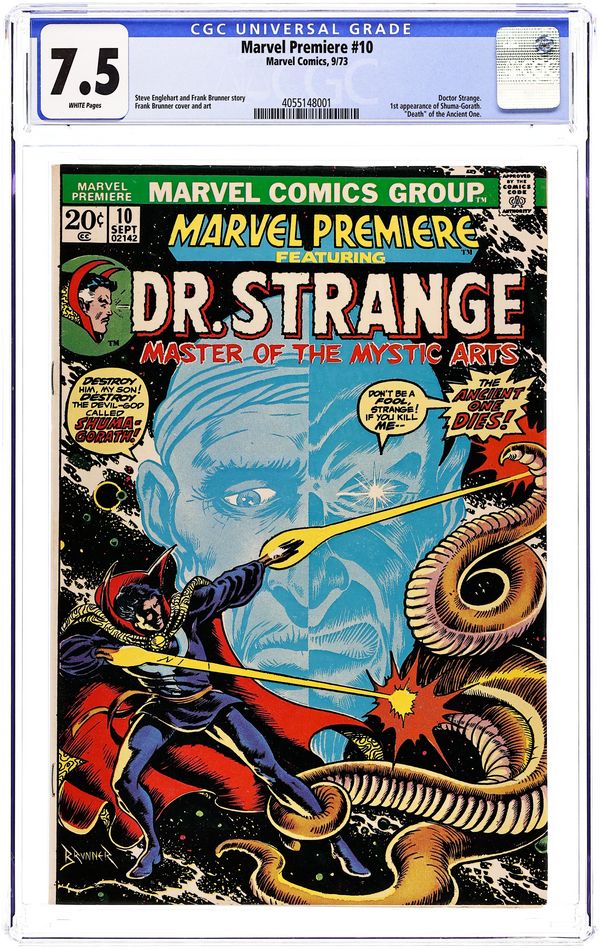 Cover art by Frank Brunner. Portal to the Past!, script by Steve Englehart (co-plot, script pages 1-17), Mike Friedrich (script pages 18-32), and Frank Brunner (co-plot), pencils by Frank Brunner, inks by Crusty Bunkers (part Neal Adams inks); Strange chooses Clea to be his disciple; He goes to make peace with Baron Mordo, and is entranced by Gypsy Queen, from whom Mordo stole the Book of Cagliostro; Strange follows Mordo into past. Letter to the editor from comics writer Ralph Macchio. 36 pgs. $0.20. Cover price $0.20.