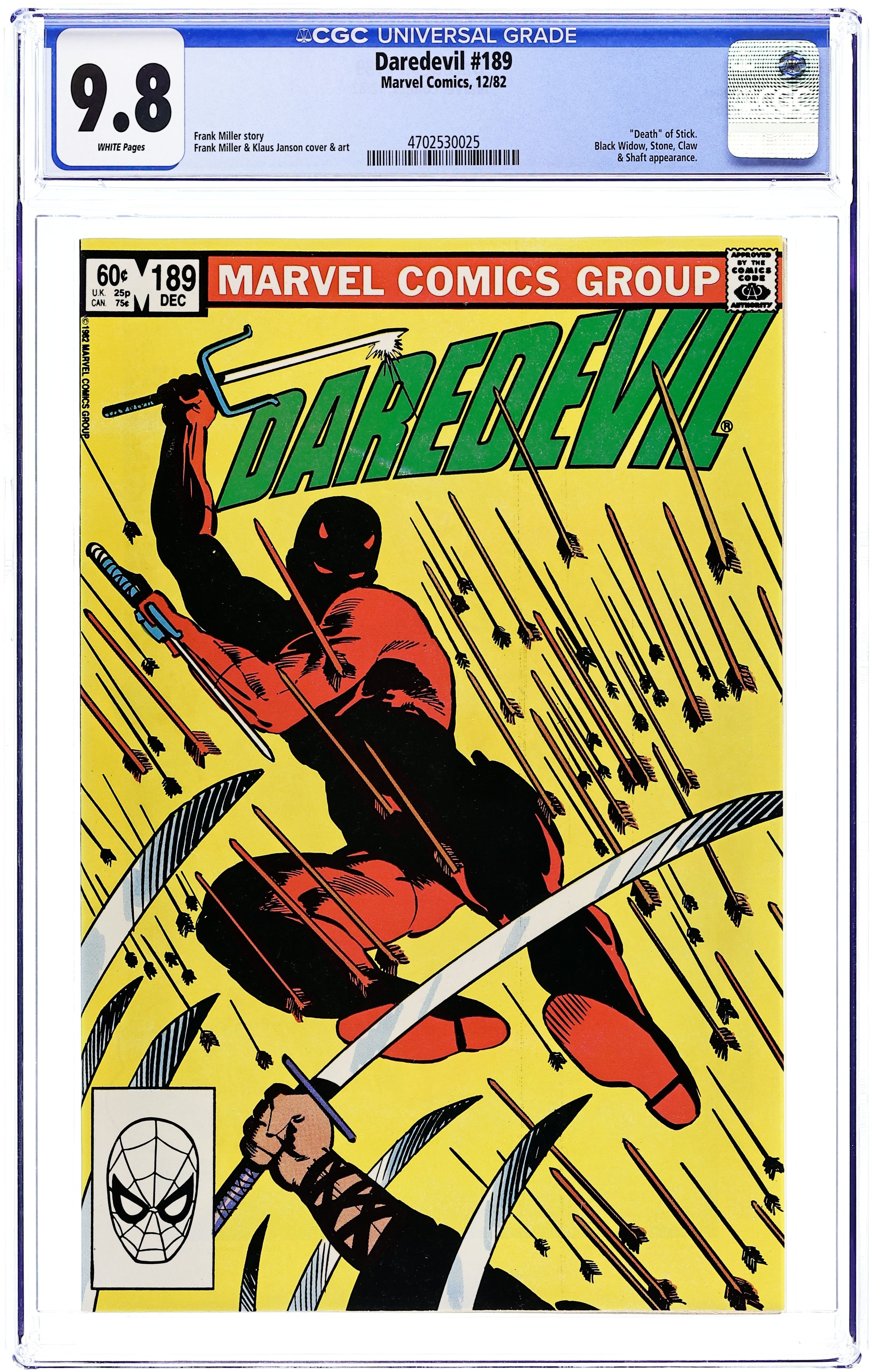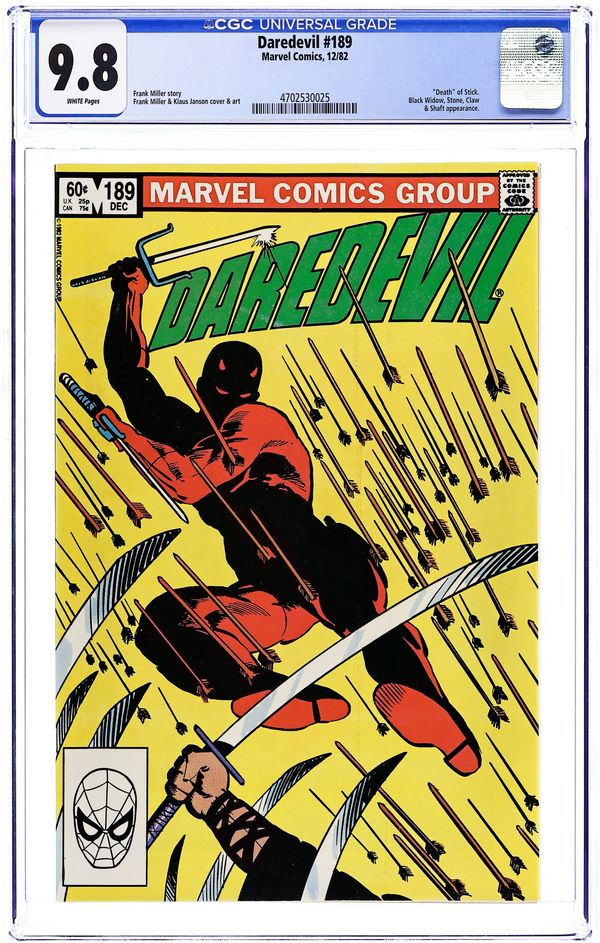 Direct Edition. Cover pencils by Frank Miller, inks by Klaus Janson. Siege, script by Frank Miller, pencils by Frank Miller (layouts) and Klaus Janson (finished art), inks by Klaus Janson; The Black Widow dies but is resurrected by Stone; DD and company have a free for all with the Hand in which Stick gives his life to save Matt; Widow and Foggy break up Heather and Matt; Stone tells DD that the Hand plans on resurrecting Elektra. Promo for next issue with Elektra replaces letters page, art by Miller. 36 pgs. Cover price $0.60. Cover price $0.60.