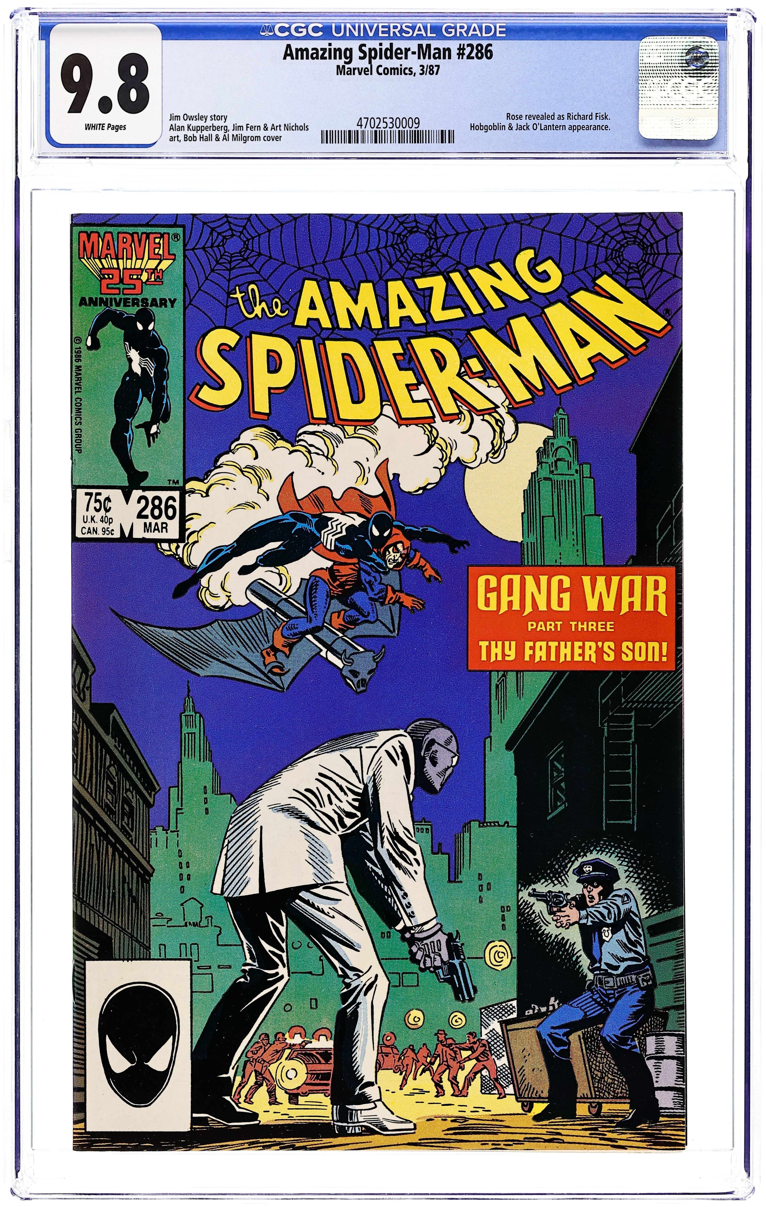 Direct Edition. Gang War: Part 3 of 5 -- "Thy Father's Son!" Script by Jim Owsley. Pencils by Alan Kupperberg. Inks by Jim Fern and Art Nichols. Cover by Bob Hall and Al Milgrom. New York City is on fire! Specifically in Jackson Heights where a meeting between the Rose and the Blue Boys has turned into a disaster! And the situation on the ground is suddenly every man for himself! The Rose, Hobgoblin, and Jack O'Lantern try to escape the fiery chaos while New York's finest and the wall-crawler attempt to restore order! Both Spider-Man and the Rose have the power of life and death in their hands! One will choose life. The other will not. A powerful story! Appearances by Mary Jane Watson, Sergeant Tork, and Lance Bannon. Cameo appearances by Aunt May and Vanessa Fisk. (Note: This issue features a full-page ad for the Fallen Angels (1987) Limited Series with art by Kerry Gammill and Tom Palmer.) 36 pages. Cover price $0.75.
