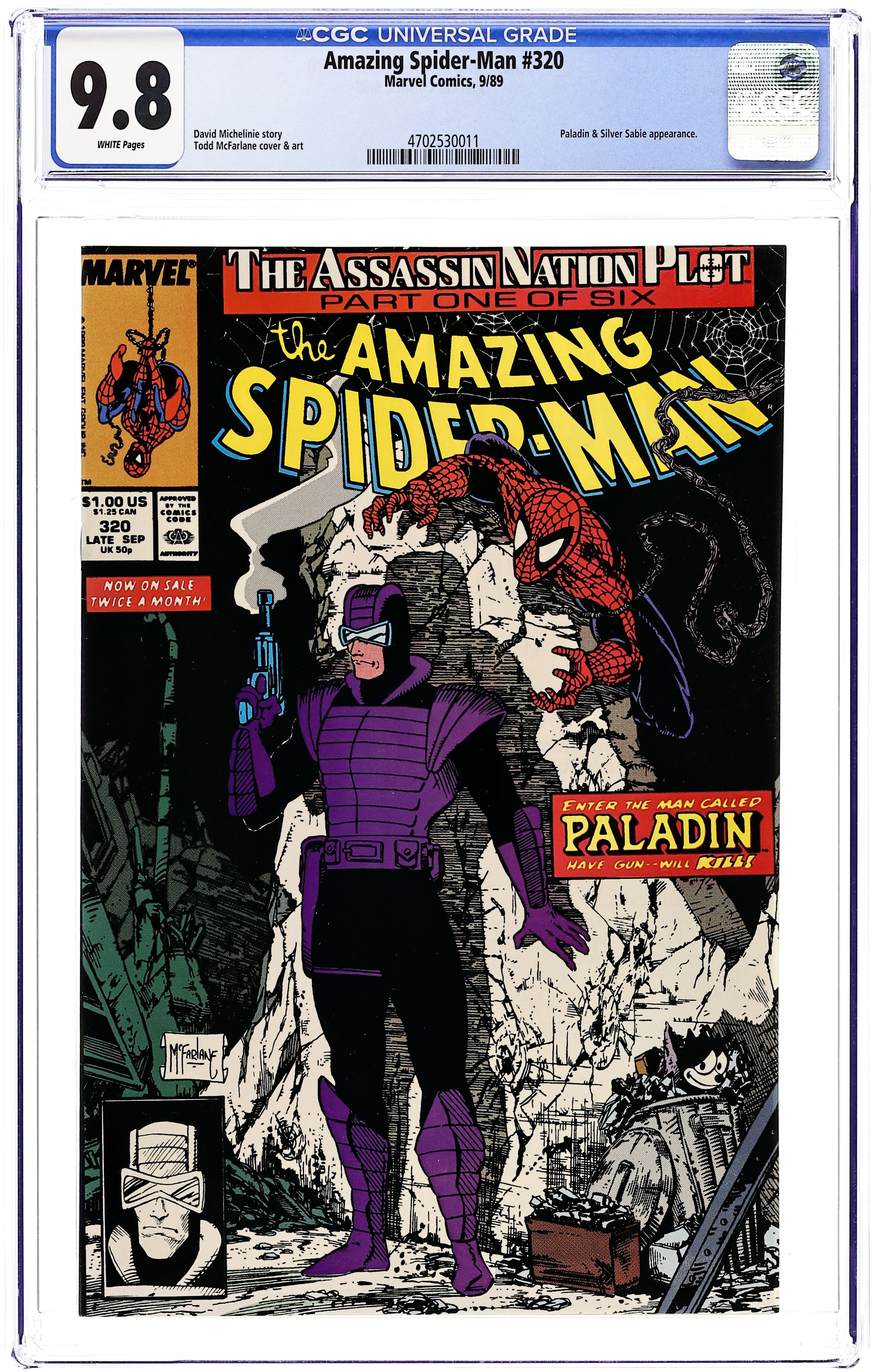 Direct Edition. The Assassin Nation Plot begins in "License Invoked" Part 1 of 6. Guest-starring Paladin. Script by David Michelinie. Art by Todd McFarlane. Cover by Todd McFarlane. What starts as a simple investigation into a Lower Manhattan robbery takes the Amazing Spider-Man on a journey across the globe and into a web of international espionage and murder! After seeing bodies lying on the ground, the web-slinger busts inside a warehouse and discovers his erstwhile ally Paladin! What is the purple-clad mercenary doing in this neck of the woods? He's probing into the Life Foundation --- an organization the wall-crawler knows all too well! The doomsday profiteers always play for keeps...as Paladin and Spidey find out...the hard way! Cameo appearances by Mary Jane Watson, Harry Osborn, Aunt May, and Silver Sable. (Notes: Paladin and the web-slinger previously worked together in Spectacular Spider-Man 105 & 106. The letters page includes a letter from Topps comics publisher Charles Novinskie.) 36 pages. Cover price $1.00.