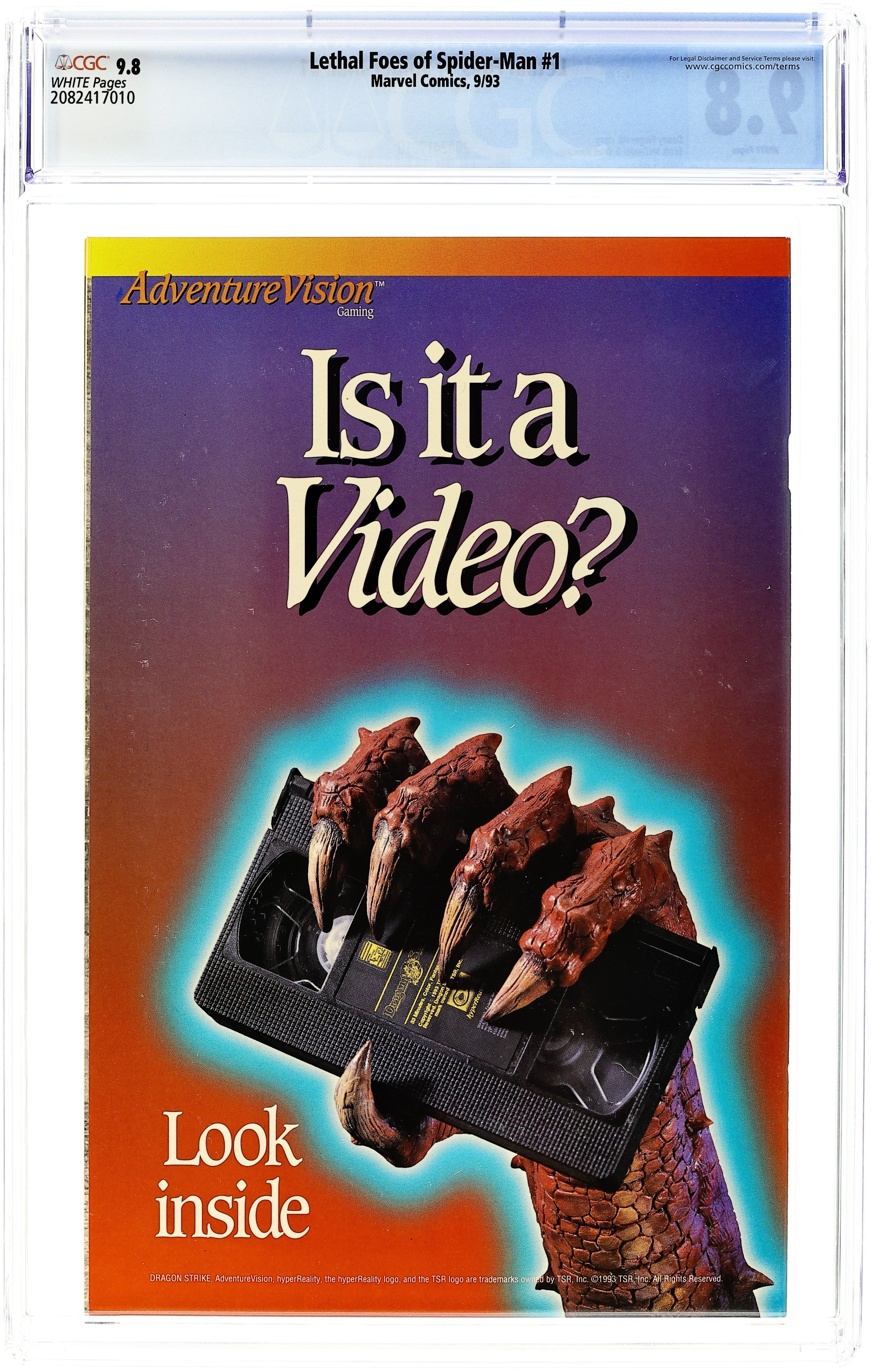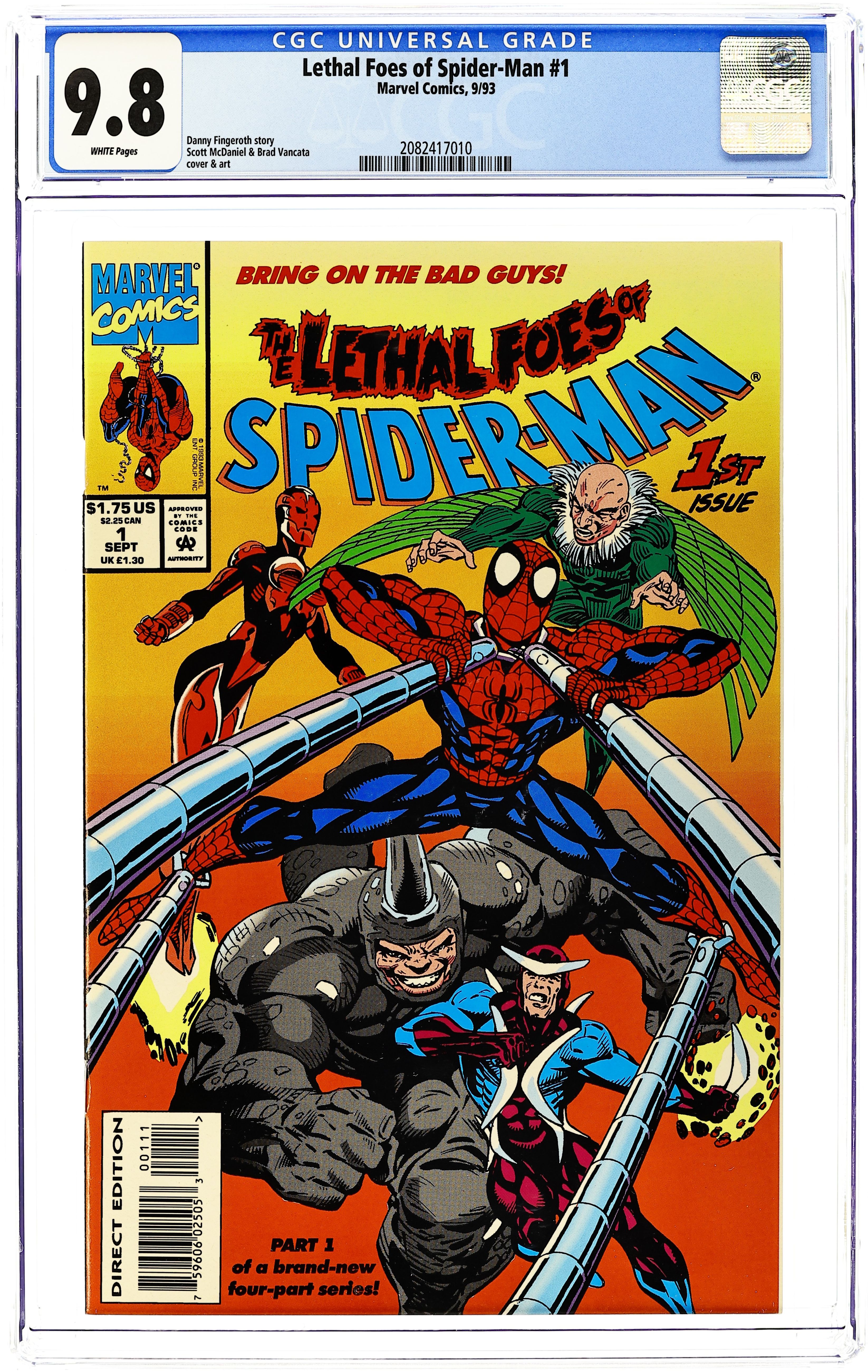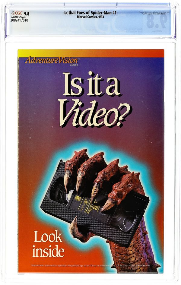 "Deadly Reunion" Part 1 of 4. Script by Danny Fingeroth. Pencils by Scott McDaniel. Inks by Brad Vancata. Cover by Scott McDaniel and Brad Vancata. The band is getting back together! The Rhino, Vulture, Boomerang, and Hardshell (aka Leila Davis) join forces again to steal the nuclear blaster from the U.S. Atomic Research Company in Yonkers! Ironically, the Daily Bugle's ace photographer happens to be at the same research company taking pictures for a photo essay about Otto Octavius! When the quartet of villains breaks into the laboratory, the wondrous wall-crawler leaps into action! Four against one! Tough odds for your friendly neighborhood Spider-Man! Meanwhile in Colorado, Doctor Octopus conspires with the Answer to escape from the Vault! Origin of the Answer. Cameo appearance by Stegron. Flashback cameos by the Kingpin, Richard Fisk, and Dagger. (Notes: Elements of the plot continue from the Deadly Foes of Spider-Man (1991) Limited Series. Every advertisement in this issue is for the Dragon Strike board game.) 32 pages. Cover price $1.75.