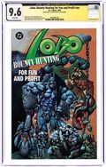 This is the 1st printing. 2nd printings are identified by having a Roman Numeral "II" in the price box on front cover. Everybody's favorite bad boy of comics returns! This time Lobo's taken a job as a skip-tracer, courtesy of his old friend Ramona, the skip-tracing hairdresser who's set him on the trail of his bounty, Loo. That's Loo, the self-proclaimed 'baddest bastich in the galaxy'...who may just be a match for Lobo himself. Yeah, right! LOBO'S BACK is a pulse-pounding, action-packed bonanza of violence, hilarity and more violence, brought to you by the creative team responsible for LOBO: THE LAST CZARNIAN and THE LOBO PARAMILITARY CHRISTMAS SPECIAL: writers Keith Giffen and Alan Grant, and artist Simon Bisley, who provides both interior art and covers. All the covers, because issue #1 features three separate covers, but all three appear on every copy - no fraggin' variant editions here. Strongly and Vehemently Suggested for Mature Readers...so put it back, kid! New Format. Cover price $1.50.