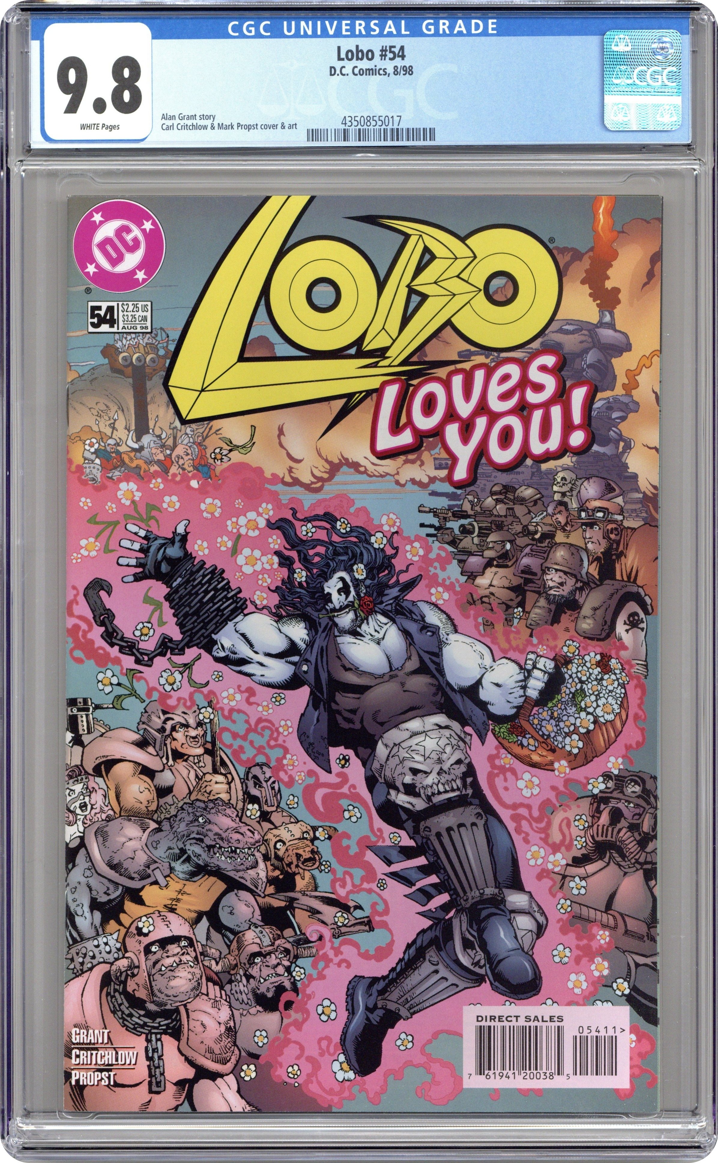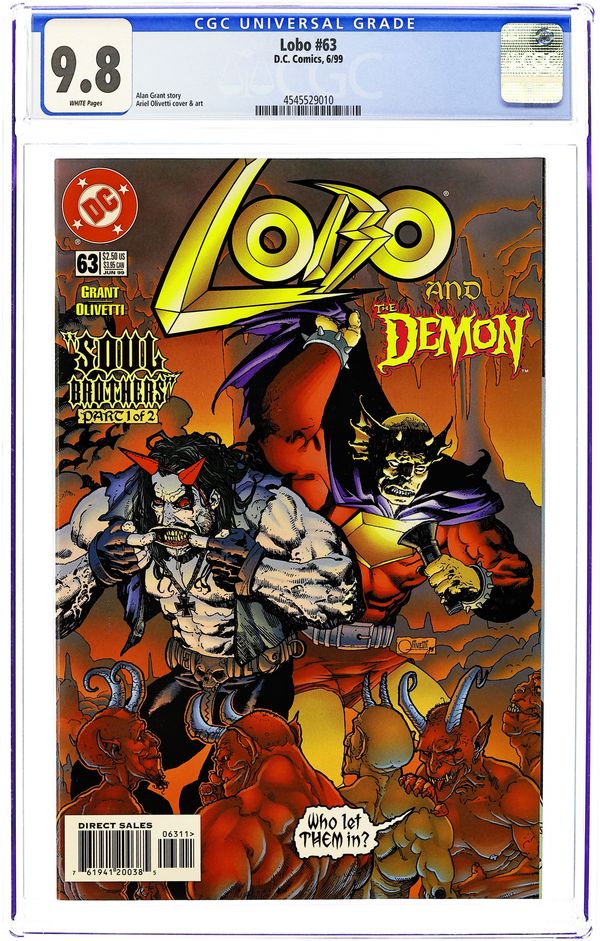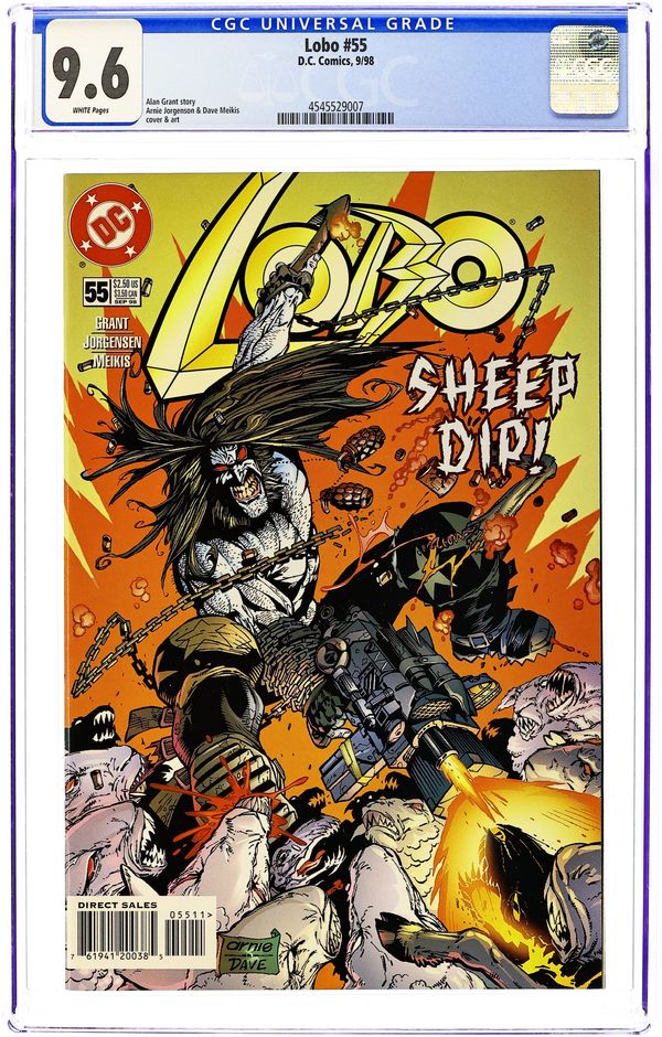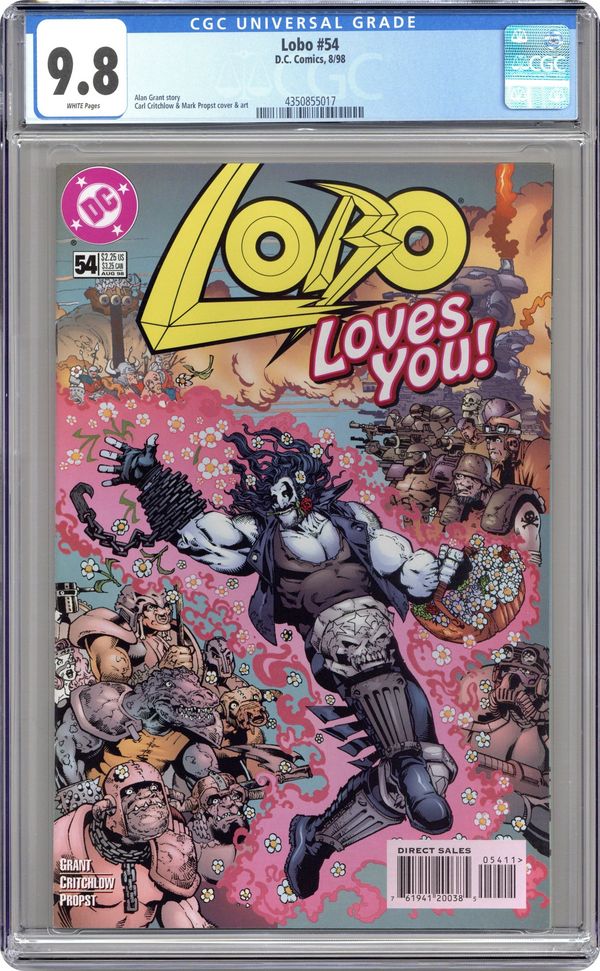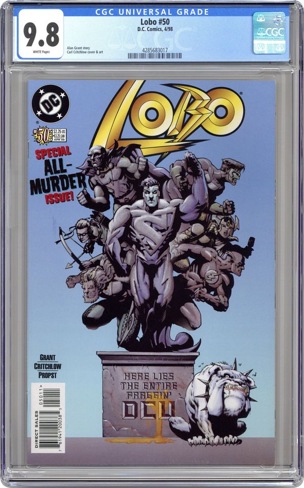 Cover pencils by Carl Critchlow, inks by Mark Propst. "Dead Heroes Don't," script by Alan Grant, pencils by Carl Critchlow, inks by Mark Propst; The heroes all have the same nightmare... Lobo's been hired to kill them; appearances by Dawg; Keith Giffen; Flash [Wally West]; Big Barda; Martian Manhunter [J'onn J'onzz]; Superman Blue [Clark Kent; Kal-El]; President Bill Clinton; Sovereign Seven; Power Girl; Green Lantern [Kyle Rayner]; Legion of Super-Heroes [Brainiac 5; Saturn Girl; Light Lass; Shrinking Violet; Ultra Boy; Ferro; Phantom Girl; Cosmic Boy]; Spectre [Jim Corrigan]; Phantom Stranger; Captain Atom [Nathaniel Adam; aka Cameron Scott]; Supergirl; Green Lantern [Alan Scott]; Mister Miracle [Scott Free]; Captain Marvel [Billy Batson]; Mary Marvel; Atom [Ray Palmer]; Superboy; Steel [John Henry Irons]; Plastic Man [Eel O'Brian]; Impulse [Bart Allen]; Firestorm [Ronnie Raymond]; and Starman [Jack Knight]. Preview of cover to LOBO #51. 36 pgs., full color. Cover price $2.25.