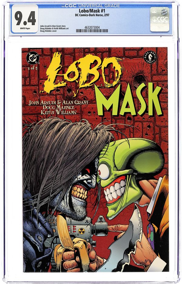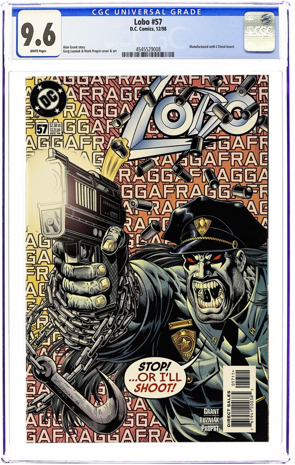 The Goldstar fan club uses Lobo's mashed-up corpse to power a gigantic galactic "GoodVibes" machine, beaming waves of Goldstar-inspired niceness to an unsuspecting cosmos. Unfortunately for the cosmos, Lobo's built-in badness overwhelms Goldstar's built-in goodness, and waves of evil corrupt all that lives! It's true! Written by Alan Grant. Art and cover by Carl Critchlow and Mark Propst. FC, 32 pg. Mando Format. Cover price $2.25.