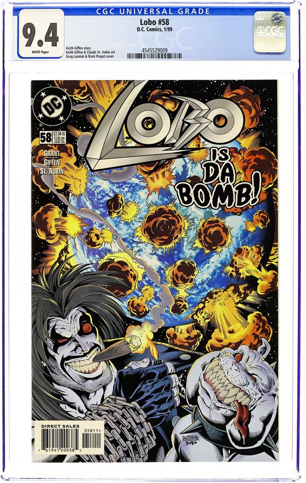 Lobo co-creator Keith Giffen returns to illustrate a special tale that he and the regular guy, Alan Grant, cooked up. Seems a villain who treats world destruction as a fine art has decided to make Earth his next masterpiece, and Lobo's been hired to stop him. Will th' Main Man save a planet that gives him nothin' but grief? Or will he grab some popcorn, sit back, and watch the fireworks? We ain't sayin', but get the melted butter ready, just in case. Written by Keith Giffen and Alan Grant. Art by Keith Giffen and Claude St. Aubin. Cover by Greg Luzniak and Mark Propst. FC, 32 pg. Cover price $2.50.