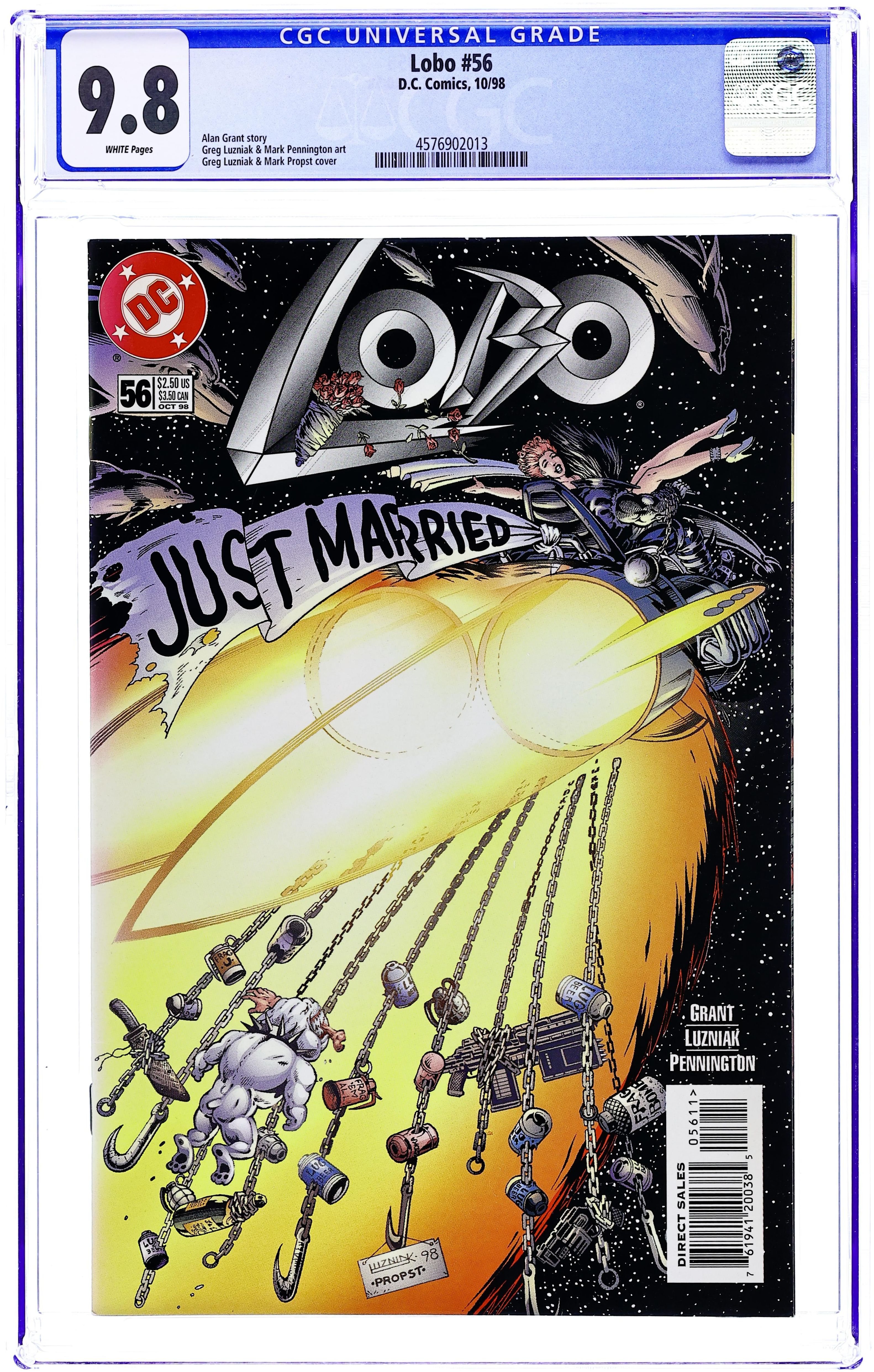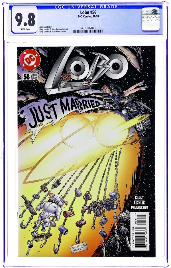 A billion hearts are breaking--literally--with the news: the baddest bastich in the galaxy's gettin' married! Surely, this is one of the signs of the Apocalypse! Yer cordially invited to be there for Lobo's bone-breakin' bachelor party, vulgar vows, rip-roarin' reception, and the crashing consummation of the nastiest nuptials in history! And any feeb who starts cryin' at the wedding gets fragged! You wuz warned! Written by Alan Grant. Art by Greg Luzniak and Mark Pennington. Cover by Greg Luzniak and Mark Propst. FC, 32 pg. Mando Format. Cover price $2.50.