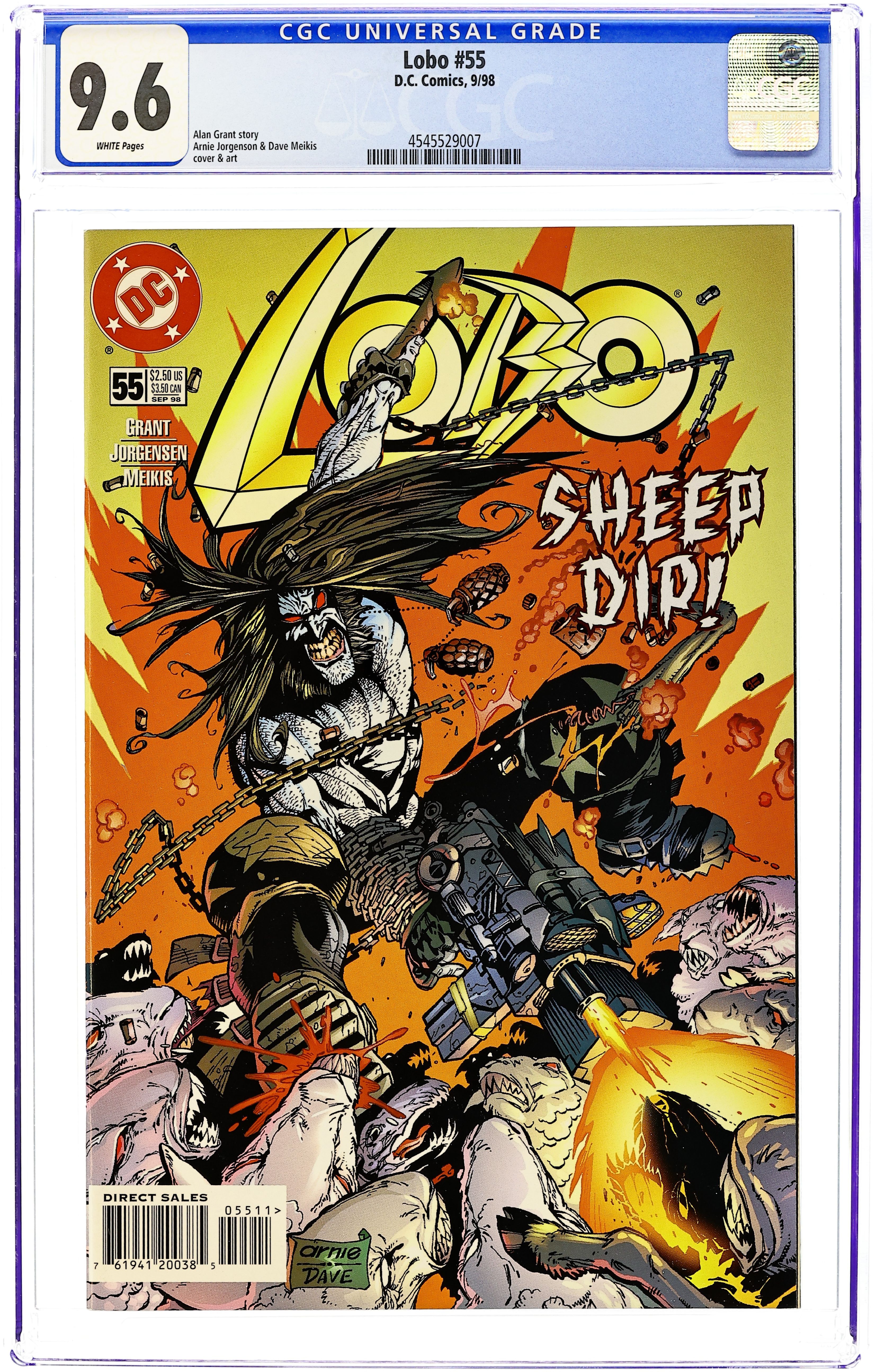 Welcome to...Sheepworld? Cecil B. Geeky, what did you do on your summer vacation? Well, he went on a big family outing to Sheepworld, a fabulously charming place...until it turned into a giant bloodbath courtesy of Lobo, who showed up on the trail of some incredibly original and surprisingly distinctive fugitives. It's a heartwarming tale sure to permanently infuriate the ASPCA. Written by Alan Grant. Art and cover by Arnie Jorgensen and David Meikis. FC, 32 pg. Mando Format. Cover price $2.50.