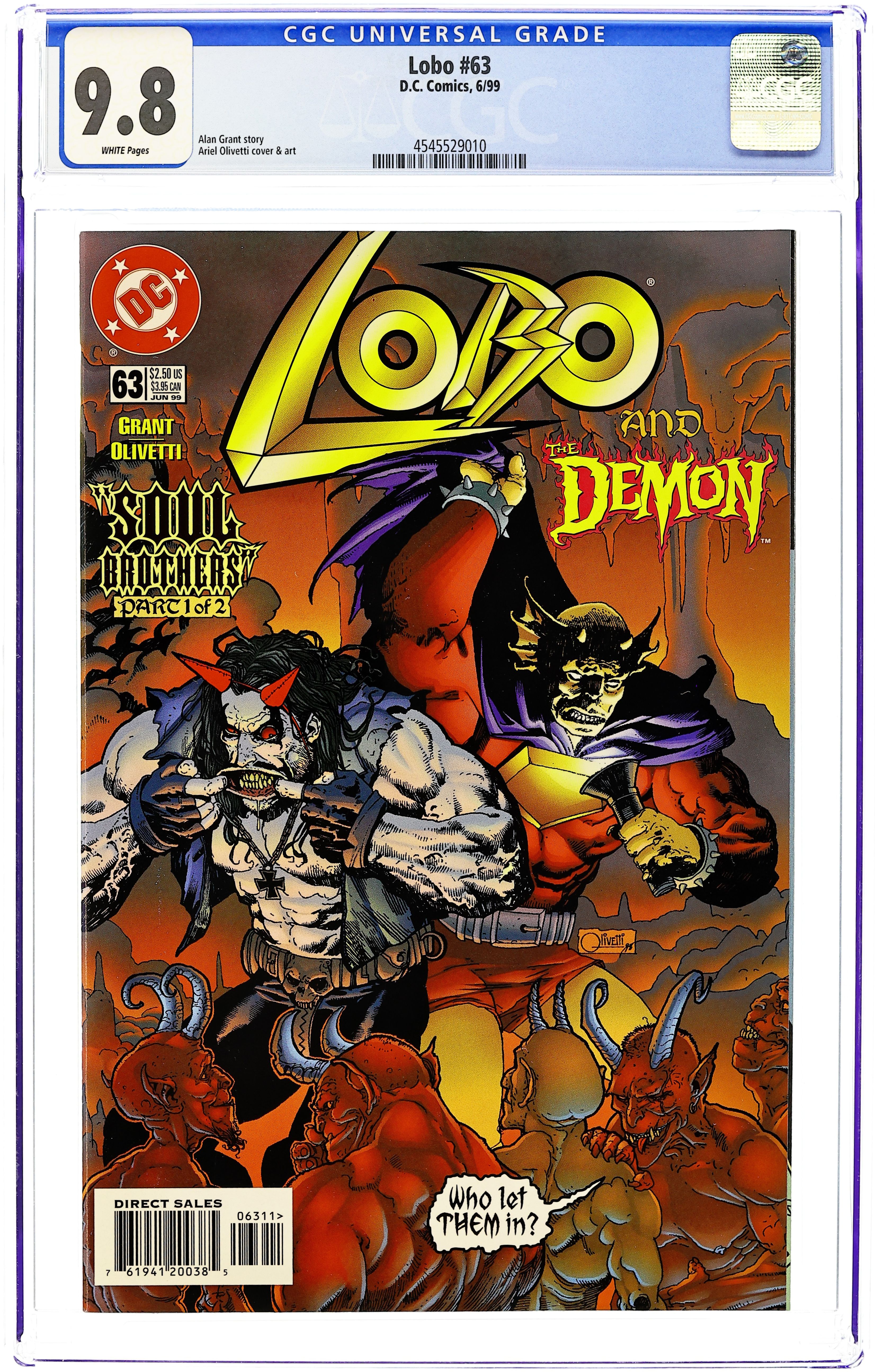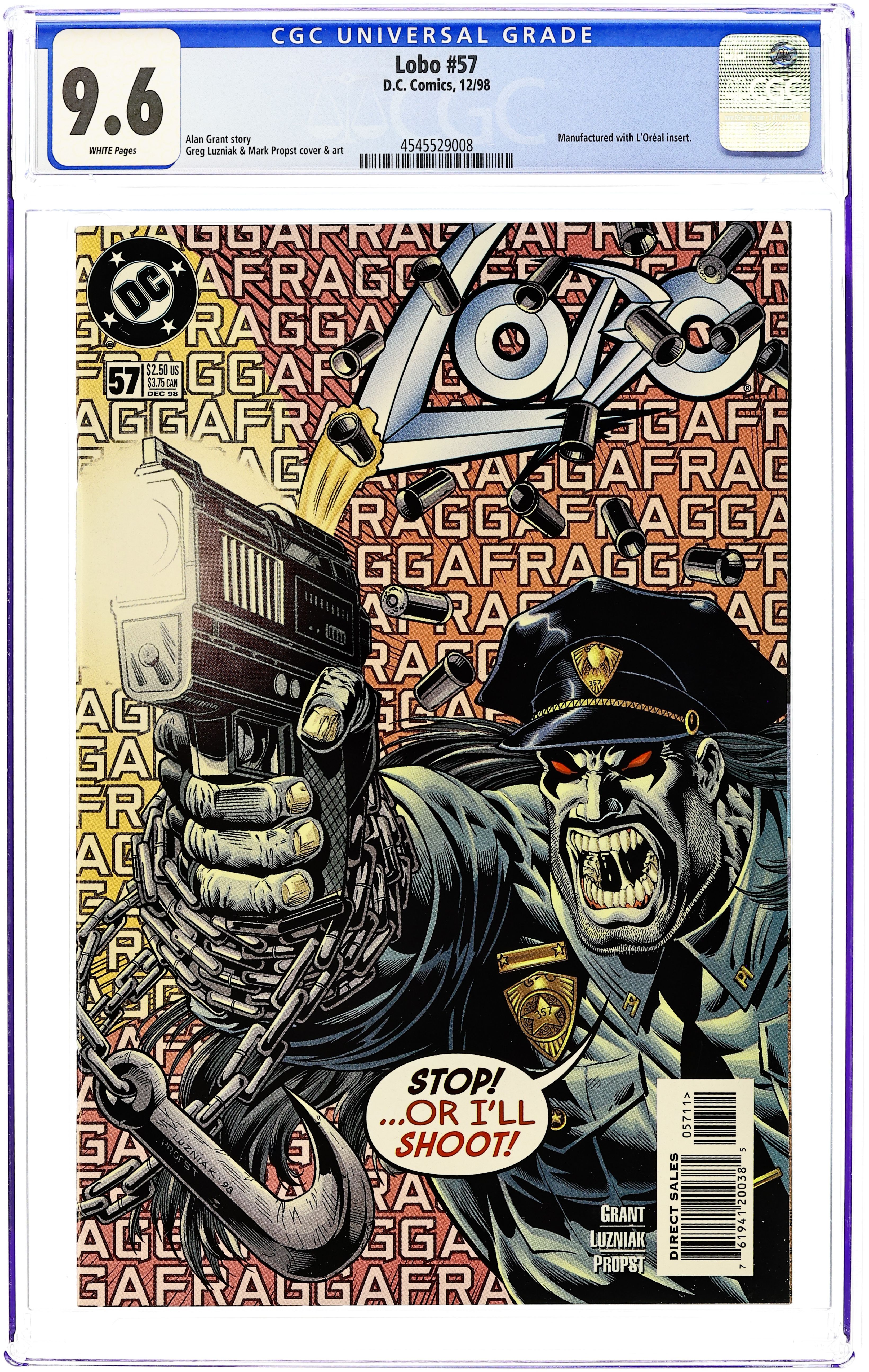 Cover art by Norm Breyfogle. "True Stories of the Highway Patrol," script by Alan Grant, art by Norm Breyfogle; Highway Patrol officers, Broderick and Crawford, kill time playing "I Spy" while behind a billboard patrolling Route 66; A super fast vehicle races past; They turn on their siren and pursue the lawbreaking Lobo, who ignores the police tailing him as he almost runs down an elderly Native American with his hawg; The Main Man catches up to a red convertible and wolf-whistles at the babe driving; Concentrating on the blonde, Lobo fails to notice the patrol car trying to stop him on his left, and concentrating on the callous motorcyclist, the police fail to notice the truck heading straight for them; Later, drug-taking and gunplay ensue. 36 pgs., full color. $2.25. Cover price $2.25.