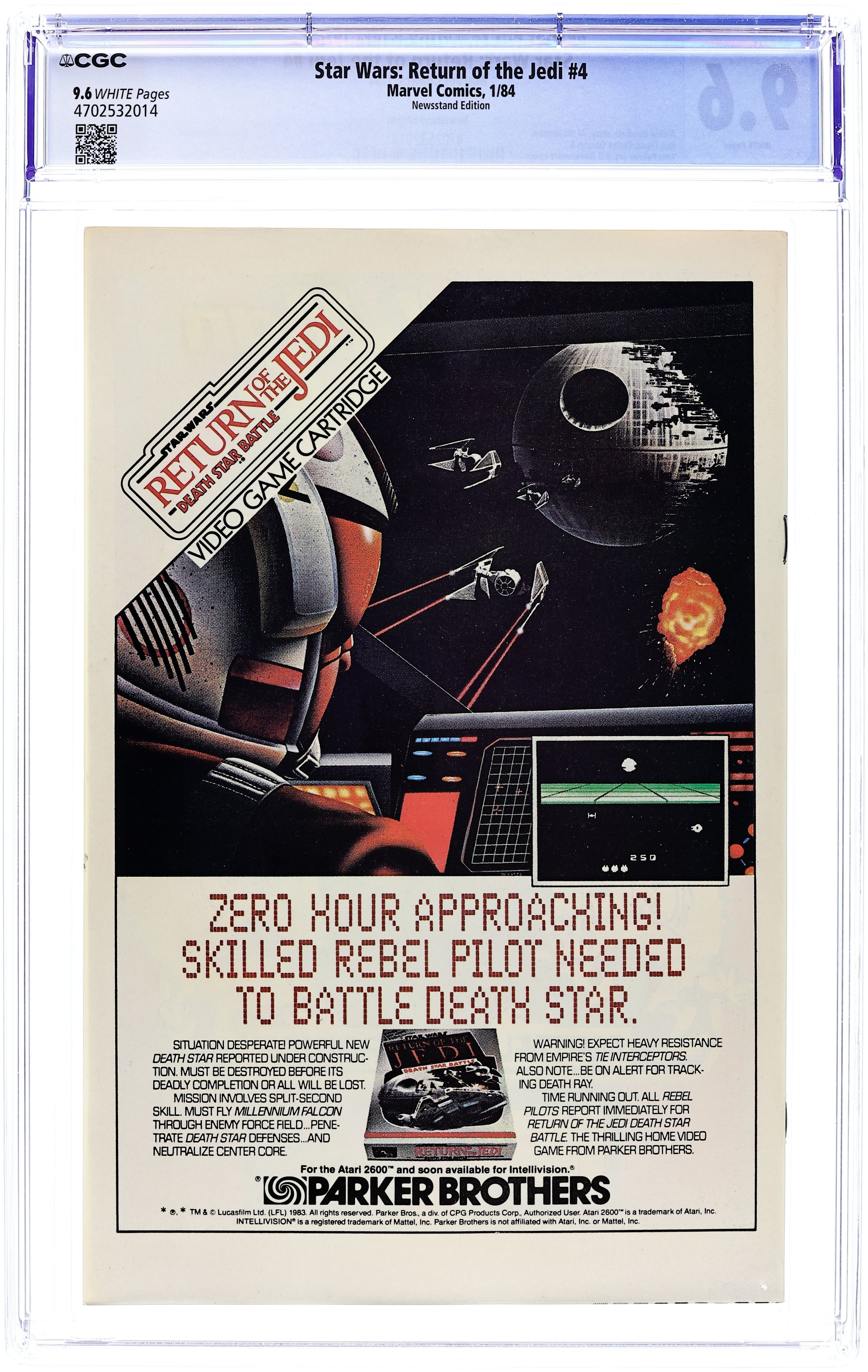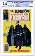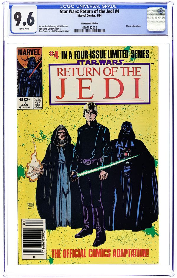 Newsstand Edition. Cover and splash page by Bill Sienkiewicz. "Chapter Four: The Final Duel!", script by Archie Goodwin, pencils by Al Williamson, Carlos Garzon, and Ron Frenz, inks by Al Williamson, Carlos Garzon, and Tom Palmer; The rebels attempt to destroy the second Death Star while Luke duels with Darth Vader and tries to find the good in him. Admiral Ackbar On The Bridge Of His Mon Calamari Battle Cruiser pinup by Rick J. Bryant. Ewok Warrior pinup by Rick J. Bryant. Rebel B-Wing Fighter pinup by Rick J. Bryant. Luke Skywalker, The Last Jedi pinup by Rick J. Bryant. Return Of The Jedi pinup by Bill Sienkiewicz. 36 pgs., full color. $0.60. Cover price $0.60.