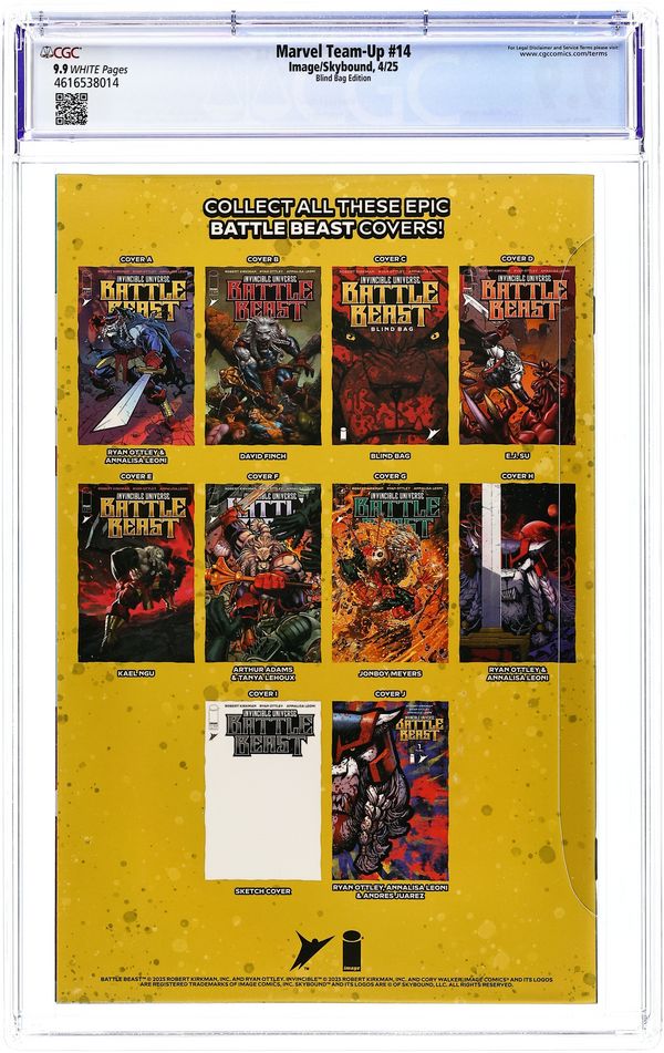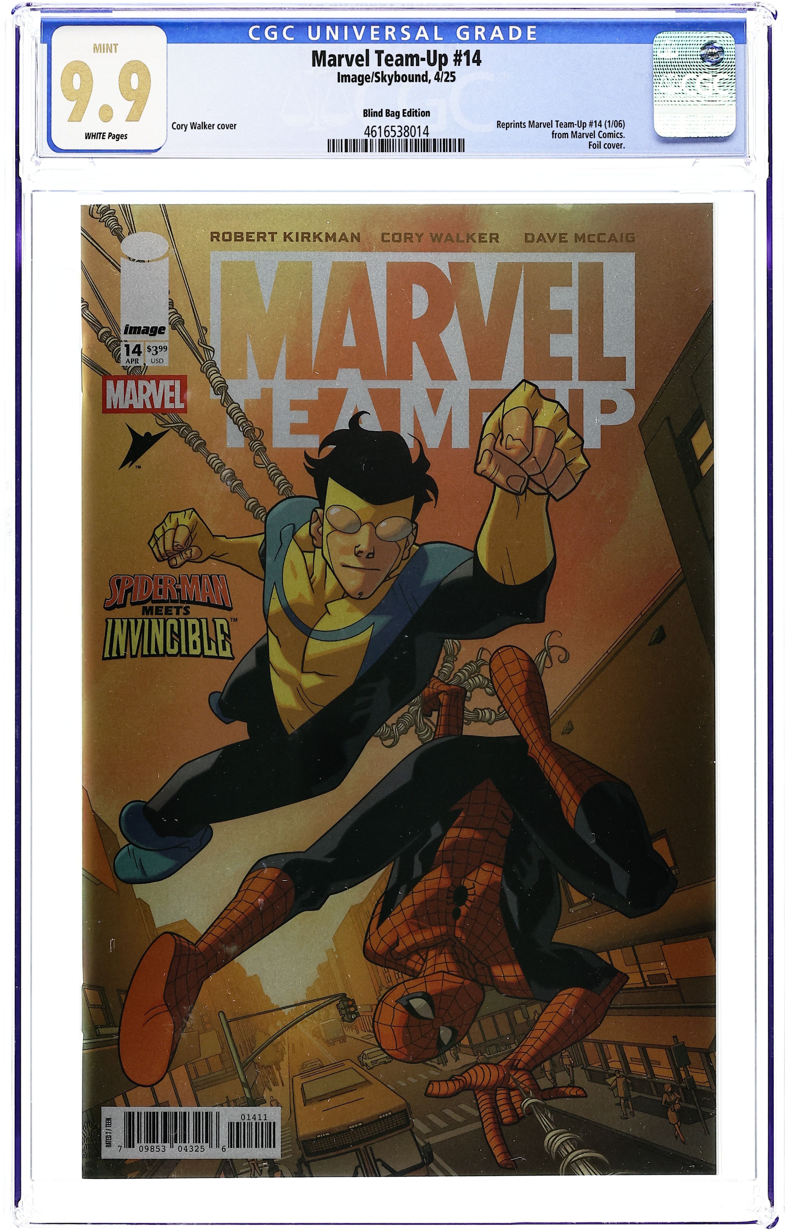 Exclusive foil variant included in some polybagged copies of Invincible Universe Battle Beast (2025 Image) 1C. Written by ROBERT KIRKMAN. Art and Cover by CORY WALKER. The team-up you thought you'd never see! Robert Kirkman and Cory Walker's INVINCIBLE bounces over to the Marvel Universe for a visit! Doctor Octopus is on the loose and Spider-Man is on the job with the help of INVINCIBLE (story continues in Invincibles #33-34). Also, the New Avengers make an appearance- ? so don't miss this one-of-a-kind crossover event! Cover price $3.99.