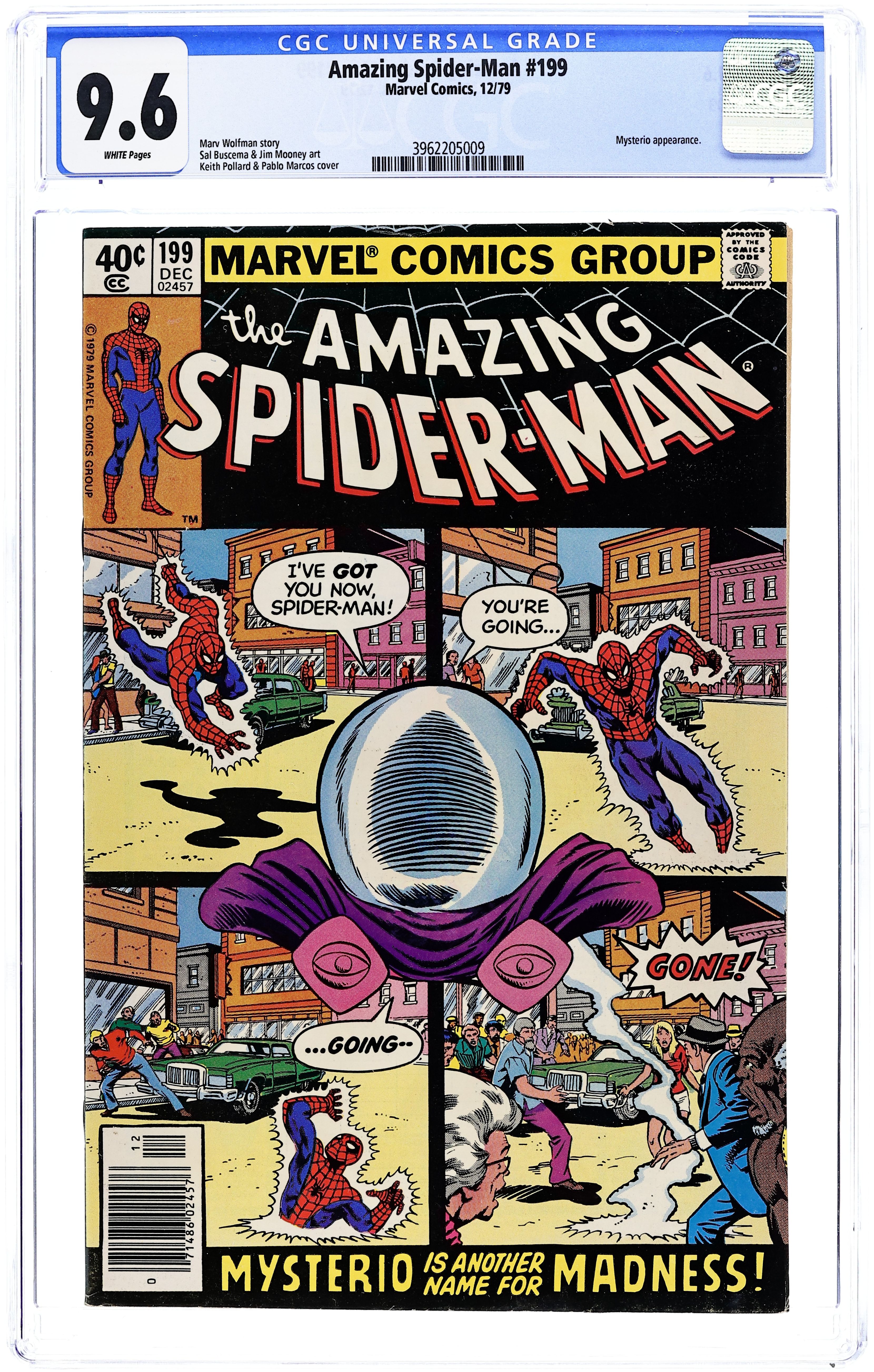 Direct Edition. "Now You See Me! Now You Die!" Part 2 of 2. Script by Marv Wolfman. Art by Sal Buscema (breakdowns) and Jim Mooney (finishes). Cover by Keith Pollard and Pablo Marcos. The madness of Mysterio plagues the wall-crawler! After escaping from the Master of Illusion's underwater trap at the nursing home, the web-slinger returns to his aunt's former home in Queens...only to find Mysterio! Why are the bad guys so interested in May's old house? The amazing one tackles Mysterio to get the answers, but unfortunately all he gets is another defeat! Will Spider-Man ever find out what happened to his dear Aunt May? Cameo appearances by Harry Osborn, Liz Allan, Flash Thompson, Sha Shan, and the burglar. (Note: The wall-crawler battles Mysterio again in Spectacular Spider-Man 50 & 51.) 36 pages. Cover price $0.40.