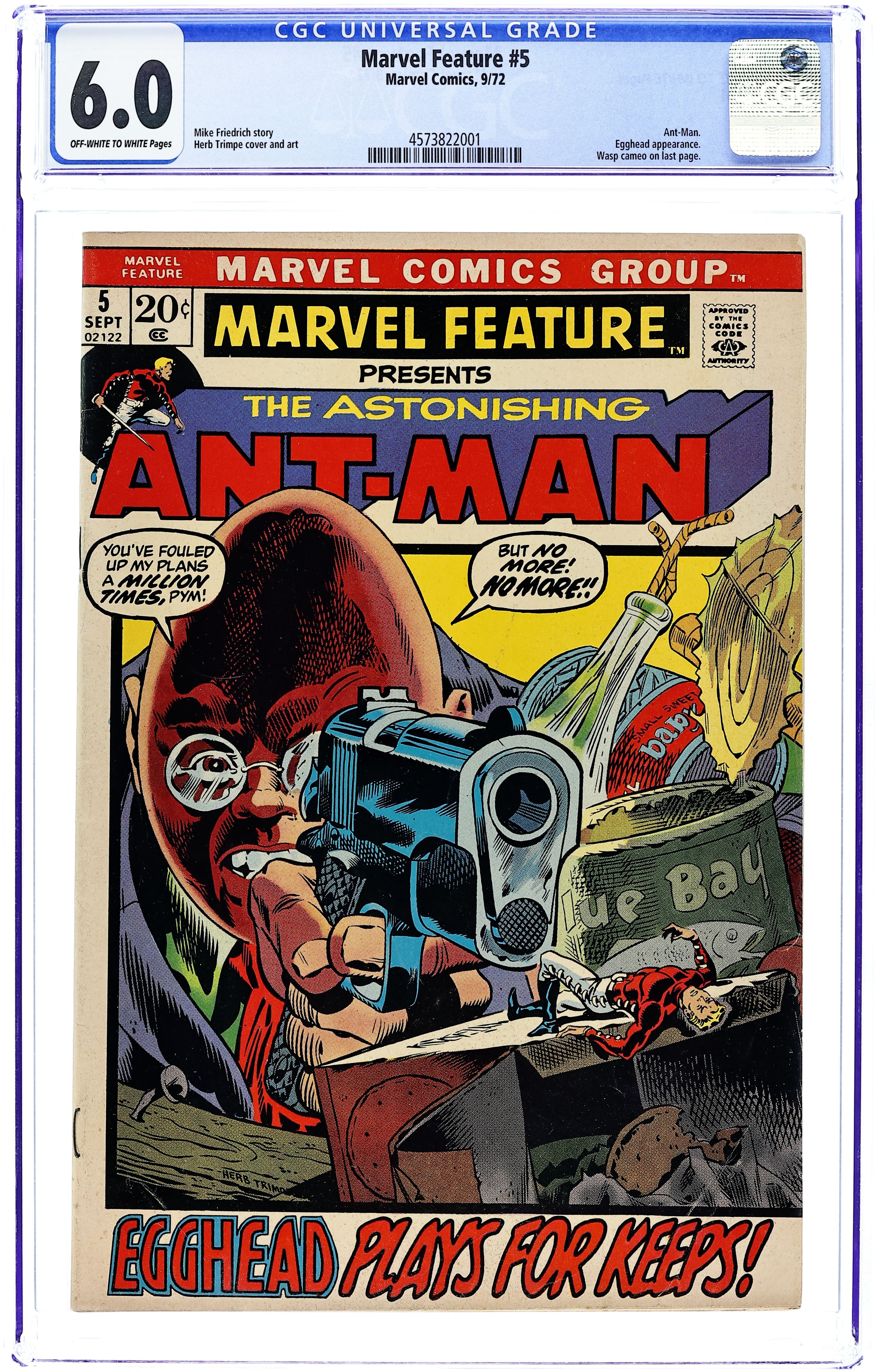 "Ant-Man No More!" Guest-starring Ant-Man and the Wasp. Script by Mike Friedrich. Pencils by Craig Russell. Inks by Frank Chiaramonte. Cover by Craig Russell and Frank Giacoia. Hank Pym has a brand new nemesis! Doctor Nemesis! After the good doctor saved Ant-Man and the Wasp from the ferocious feline last issue, it appeared that he might be a friend! But unfortunately he is definitely a foe! And now Dr. Nemesis wants Ant-Man to join him in a raid on Avengers Mansion! Or he will kill Janet! Left with no other options, Hank Pym infiltrates his old stomping ground with his devious blackmailer in tow! Is Doctor Nemesis setting a trap for the Avengers? Or is Ant-Man actually setting a trap for Doctor Nemesis? Cameo appearances by the Black Panther, Captain America, Iron Man, and the Vision. Flashback cameos by Egghead and Whirlwind. First reprinted story: "The Itch" Art by Al Hartley. Originally published in Mystic 35 in 1955. Second reprinted story: "Hiding Place" Art by Tony DiPreta. Originally published in Mystic 14 in 1952. (Notes: This issue completes the seven-issue run in the Marvel Feature title featuring Hank Pym as the Astonishing Ant-Man. The Wasp and Ant-Man appear next in Captain Marvel 35 & 37. They return to Earth's Mightiest Heroes in Avengers 137.) 32 pages Cover price $0.20.