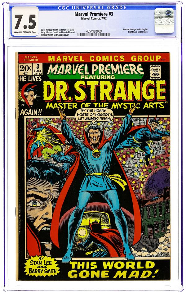 Cover pencils by Barry Windsor-Smith, inks by Frank Giacoia. While the World Spins Mad!, script by Barry Smith (plot) and Stan Lee (dialogue), pencils by Barry Smith, inks by Dan Adkins; Sensing evil, Strange is so focused on seeking it out he's almost hit by a truck; He calls upon The Ancient One, who warns him of the nature of the evil, but is still mystified; Then he finds himself confronted by someone (or something) who takes his own form, and tells him he's "already defeated"; Only when he discovers his oldest enemy is at the bottom of it does he also realize he was hit by the truck--and has been in a hospital bed ever since!; On recovering, he erases the memory of the night's events from the doctor's mind, as "Many things there are that mankind must not know..." 36 pgs. $0.20. Cover price $0.20.