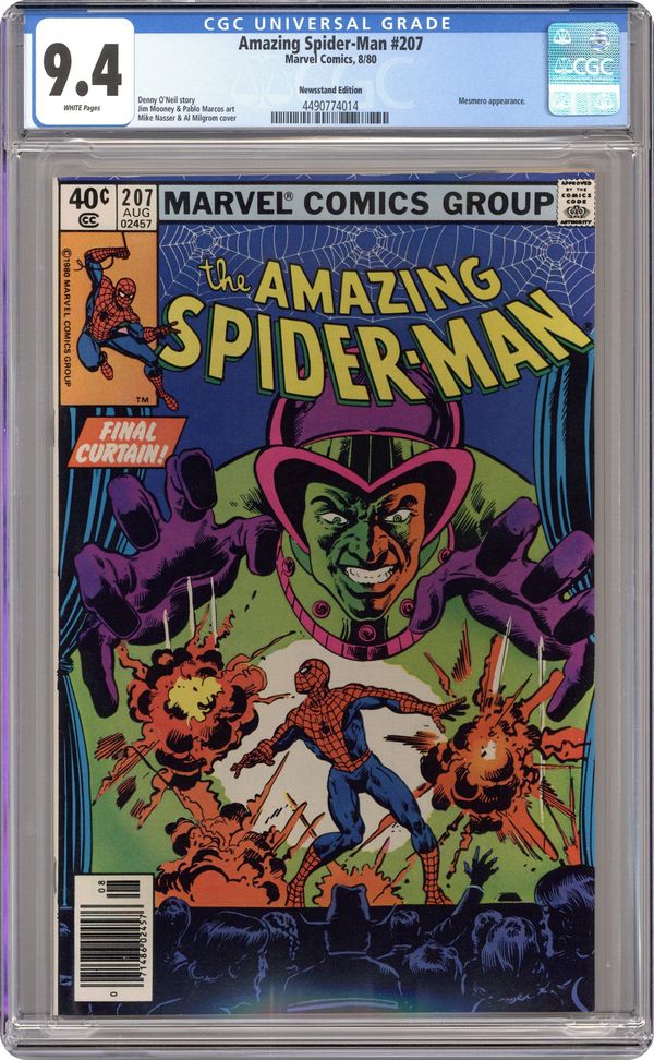Newsstand Edition. "The Prophecy of Madame Web!" First appearance of Madame Web. Script by Denny O'Neil. Art by John Romita Jr. (breakdowns) and Joe Sinnott (finishes). Cover by John Romita Jr. and Al Milgrom. Masked gunmen barge into the board room of the Daily Globe and kidnap its publisher K.J. Clayton! Fortunately though, the web-slinger is nearby and gives chase! The wall-crawler doesn't catch the criminals, but he does catch a clue! A mysterious clairvoyant called Madame Web is somehow connected to the victim! After befriending the aging soothsayer and heeding her advice, Spider-Man rushes off to the rescue! Can the web-slinger find the missing publisher and get the Daily Globe back in circulation? Cameo appearance by J. Jonah Jameson. (Notes: Peter Parker ends his employment with the Daily Globe. Madame Web appears next in Amazing Spider-Man 216. John Romita Jr. begins his three-and-a-half year run as the penciler of the Amazing Spider-Man title.) 36 pages, full color. Cover price $0.50.