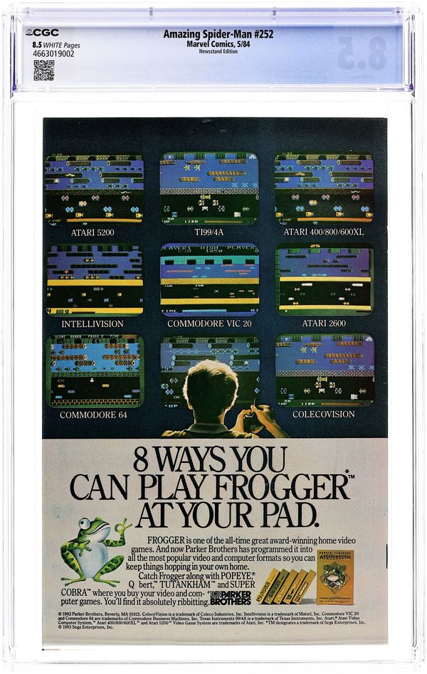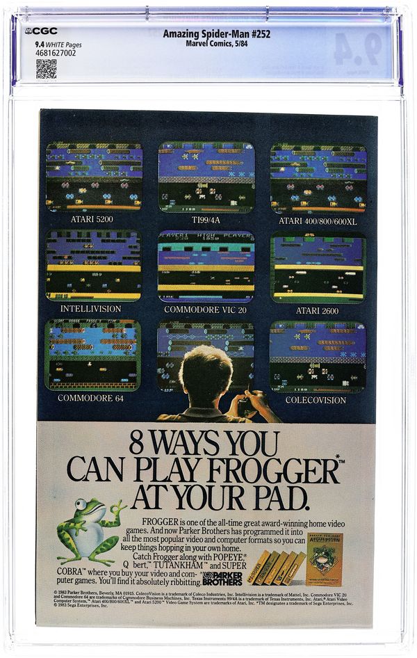 Direct Edition. First appearance of Spider-Man's new black (alien symbiote) costume in "Homecoming!" Plot by Roger Stern. Script by Tom DeFalco. Pencils by Ron Frenz (breakdowns) and Brett Breeding (finishes). Cover by Ron Frenz and Klaus Janson. One of the landmark issues of the Amazing Spider-Man! With a brilliant flash of light in Central Park, the wondrous wall-crawler is back! And he looks a whole lot different! Wow, a new costume! What happened during the Secret Wars on the Beyonder's world? The ominous truth will be revealed to both the readers and the web-slinger in the days and weeks ahead! Cameo appearances by the Black Cat, Dr. Curt Connors, J. Jonah Jameson, Joe Robertson , Aunt May, Captain America, Captain Marvel, Hawkeye, Iron Man, Thor, and the Wasp. (Notes: Marvel Age 12 contained sketches of the new costume two months prior to the publication of this issue. Spidey's new costume was also unveiled in Marvel Team-Up 141 and Spectacular Spider-Man 90. The first issue of the (1984) Marvel Super Heroes Secret Wars Limited Series was published the same month as Amazing Spider-Man 252. The web-slinger discovers his new costume in issue 8 of the limited series. The Frenz-Janson cover is a tribute to the iconic cover of Amazing Fantasy 15. This story was reprinted in Marvel Tales 266. The letters page contains a statement of ownership: average print run 470,527; average paid circulation: 241,762. 36 pgs. Cover price $0.60.