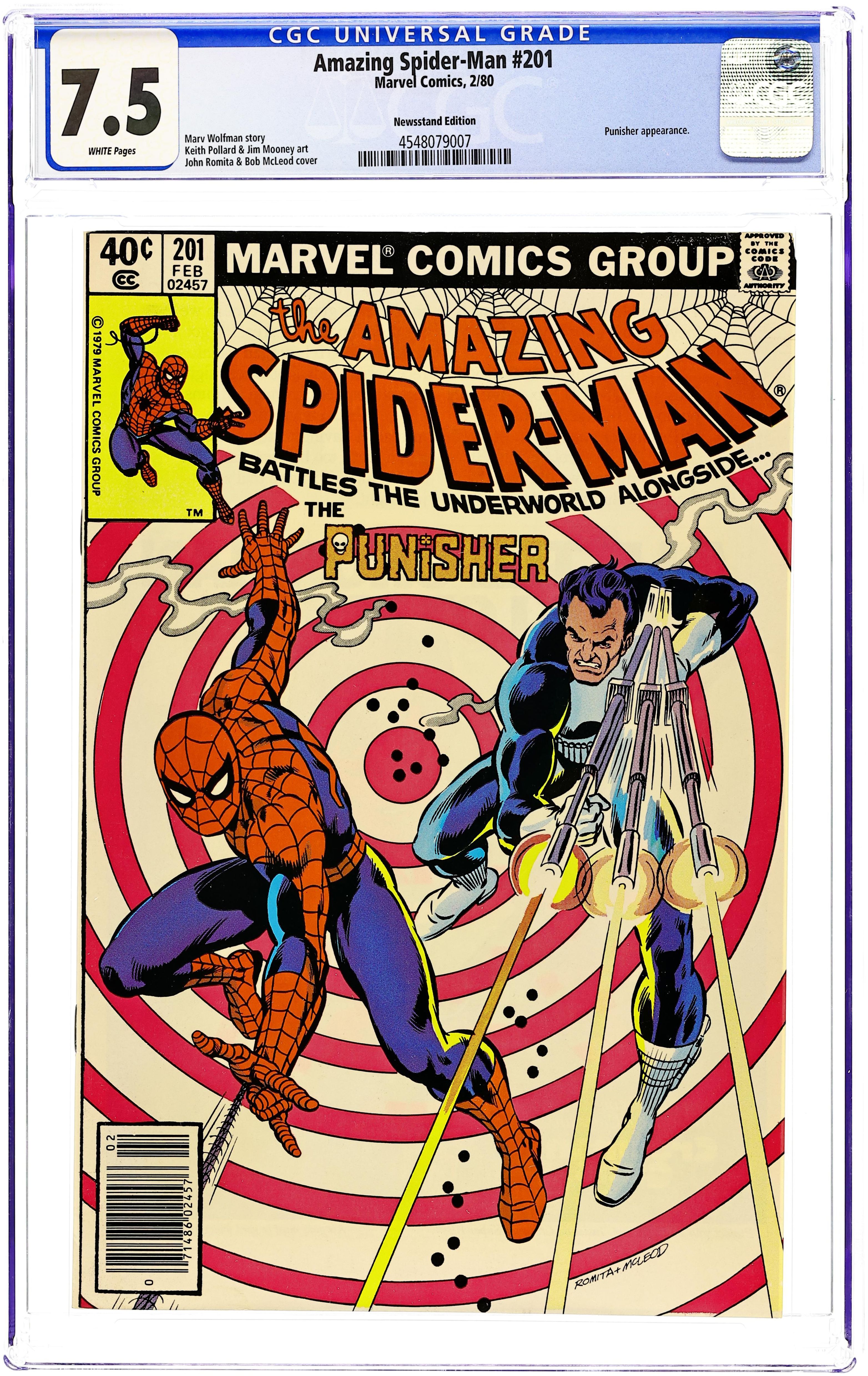 Newsstand Edition. "One for Those Long Gone!" Part 2 of 2. Guest-starring the Punisher. Script by Marv Wolfman. Art by Keith Pollard (breakdowns) and Jim Mooney (finishes). Cover by Keith Pollard and Joe Rubinstein. After surviving his nervous encounter with the Punisher, Peter Parker slips on his red and blue costume and joins the gun-toting vigilante's pursuit of the drug lords! Spider-Man wants to capture them. The Punisher wants to kill them. Something has got to give! Will the superhero or the anti-hero win the battle of wills? Cameo appearances by J. Jonah Jameson, Joe Robertson, and Dr. Jonas Harrow. (Notes: Spider-Man and the Punisher tangle again in Amazing Spider-Man Annual 15. This issue includes a sideways full-page ad featuring Batroc the Leaper promoting Crazy Magazine. This story was reprinted in Marvel Tales 219.) 36 pages Cover price $0.40.