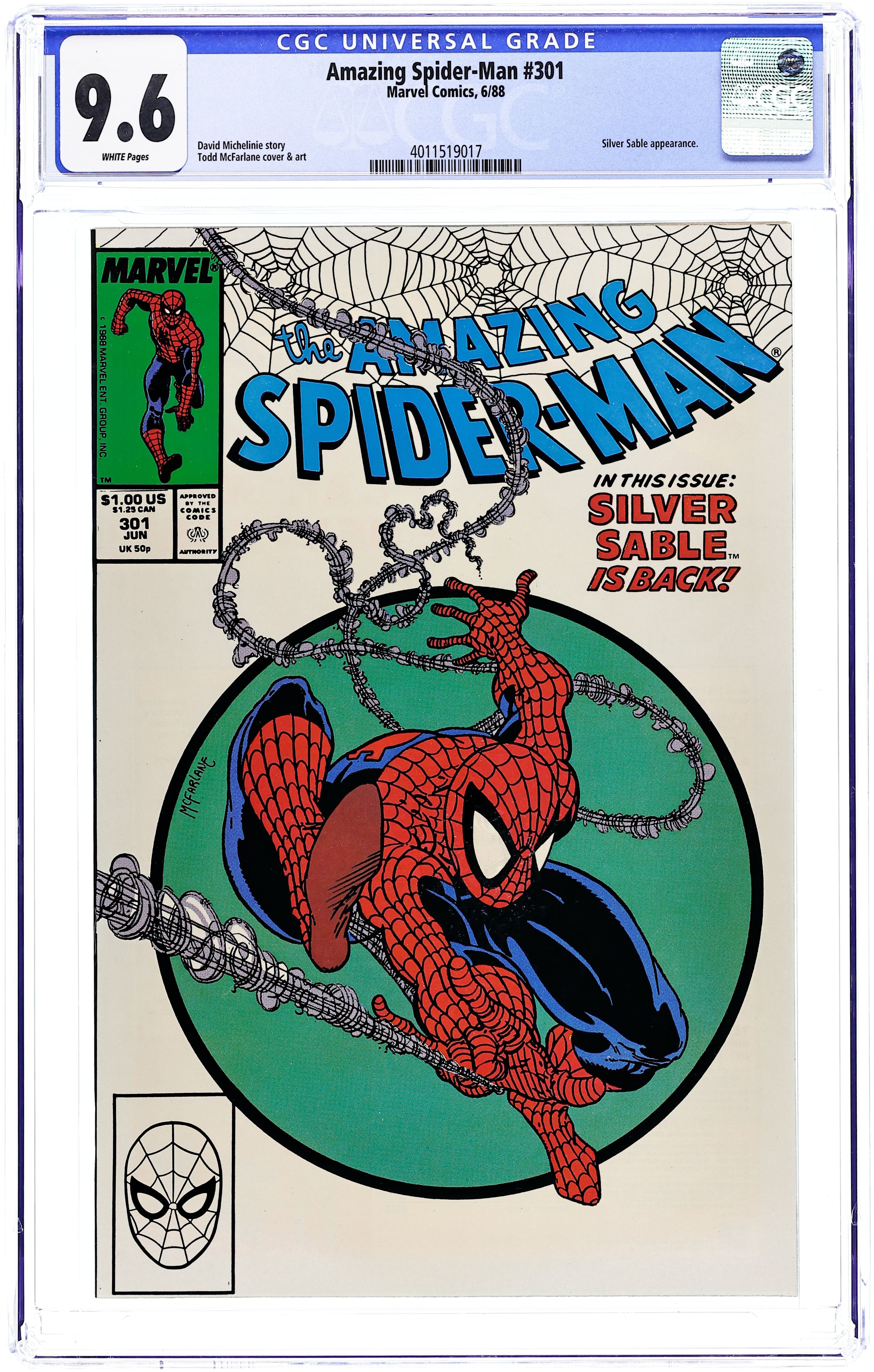 Newsstand Edition. "The Sable Gauntlet!" Guest-starring Silver Sable. Script by David Michelinie. Art by Todd McFarlane. Cover by Todd McFarlane. The first 300 issues of the Amazing Spider-Man are in the books after the web-slinger's epic battle vs. Venom last issue! And now the next chapter in the wall-crawler's anthology begins with an encounter with his favorite mercenary: Silver Sable! The enchanting sable agrees to make a test run through the security systems of a new high-rise office building, but deadly danger awaits on the top floor! Will Spidey catch the elevator in time? Cameo appearances by Mary Jane Watson and Dr. Morris Sloan. First $1.00 issue. (Notes: The cover is the same artwork (with different colors) as the cover to issue 300. This issue includes a full-page ad for the first appearance of Typhoid Mary in the Daredevil (1st) series -- art by John Romita Jr. and Al Williamson. The letters page contains a statement of ownership: average print run 469,913; average paid circulation 284,692.) 36 pgs. Cover price $1.00.