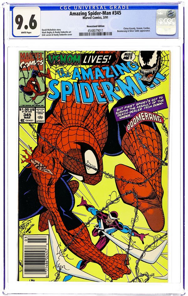 Newsstand Edition. Cover pencils by Erik Larsen, inks by Randy Emberlin. Second appearance of Cletus Kasady (Carnage) in "Gun From the Heart!" Script by David Michelinie, pencils by Mark Bagley, inks by Randy Emberlin; Through Silver Sable (and without his knowledge of who the real boss is), Justin Hammer hires Spidey to take down Cardiac and then hires Boomerang to take down Spidey; Eddie Brock is freed from prison by the Venom symbiote, but as he leaves his cell, a little drip from the costume stays behind to keep Cletus Kasady company; Venom cameo. The letters page has a statement of ownership--average print run 489,589; average paid circulation 334,893. 36 pgs., full color. Cover price $1.00.