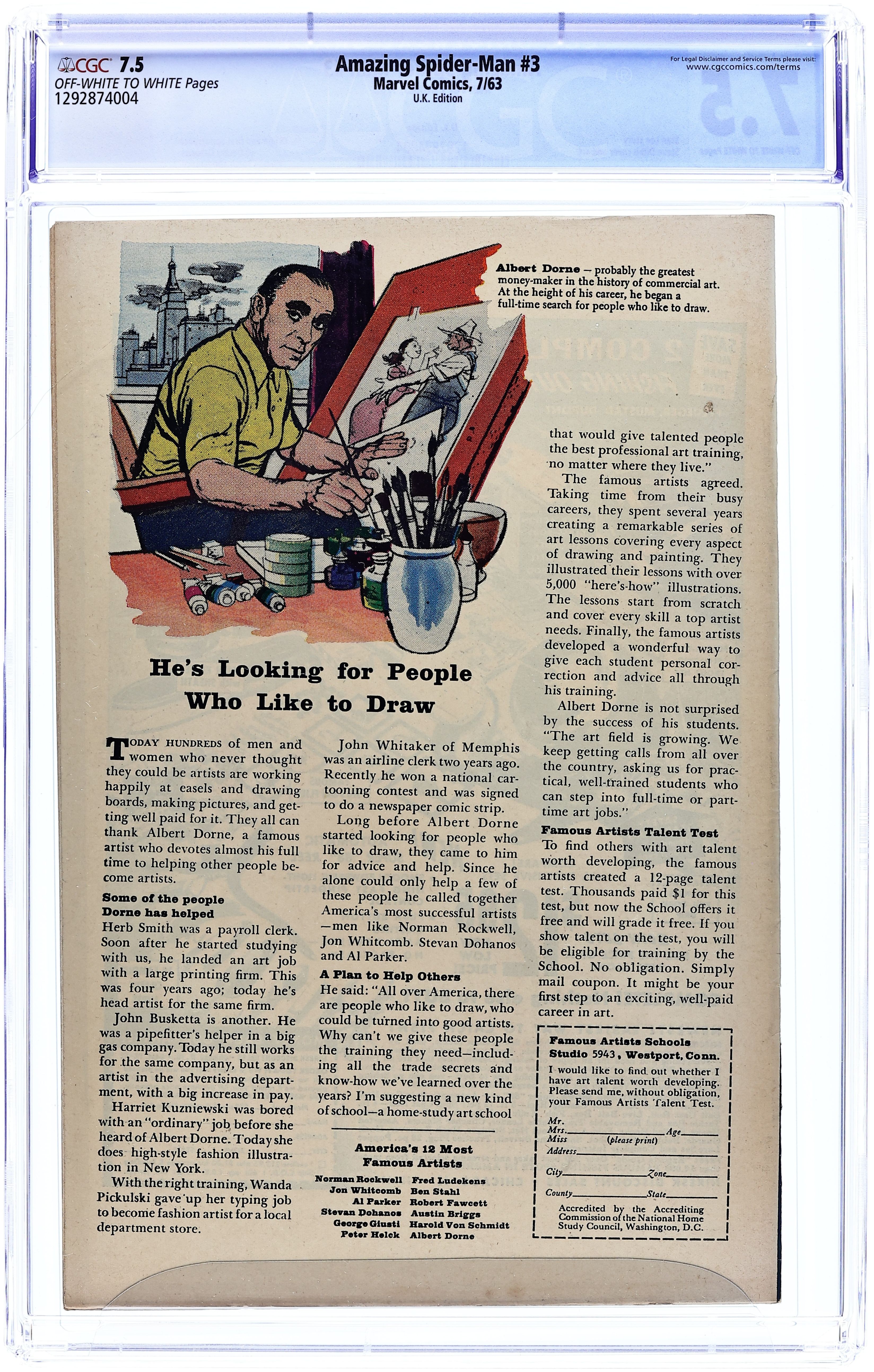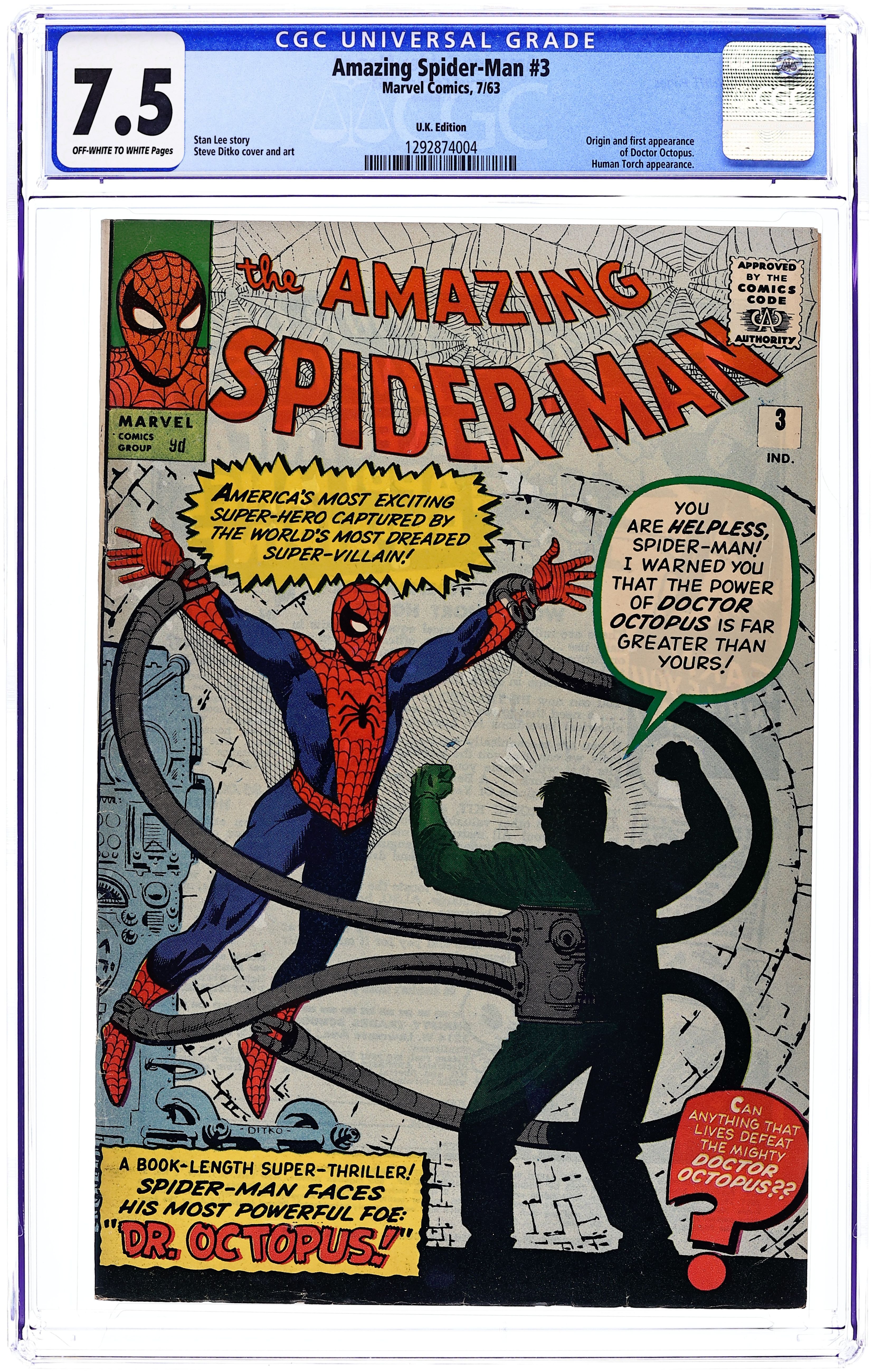 UK edition. Identical to US edition, but has 9d cover price. First appearance of Dr. Octopus in "Doctor Octopus." Script by Stan Lee, art by Steve Ditko. Human Torch (of the Fantastic Four) guest appearance. Spider-Man pin-up page by Ditko. Ditko cover. Reprinted in Marvel Tales # 140. First issue with a letters column (including a letter by mycomicshop.com president Buddy Saunders!).