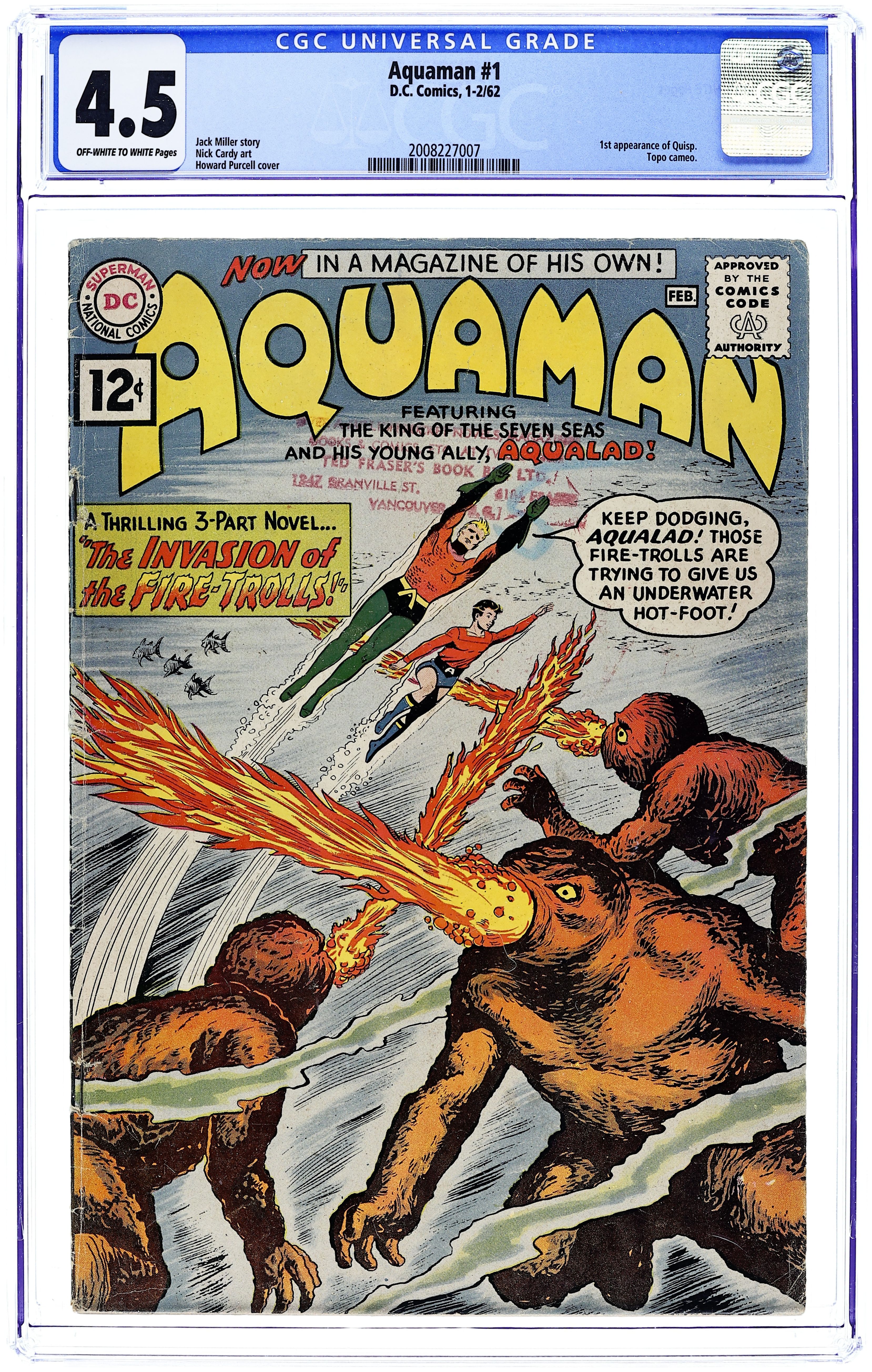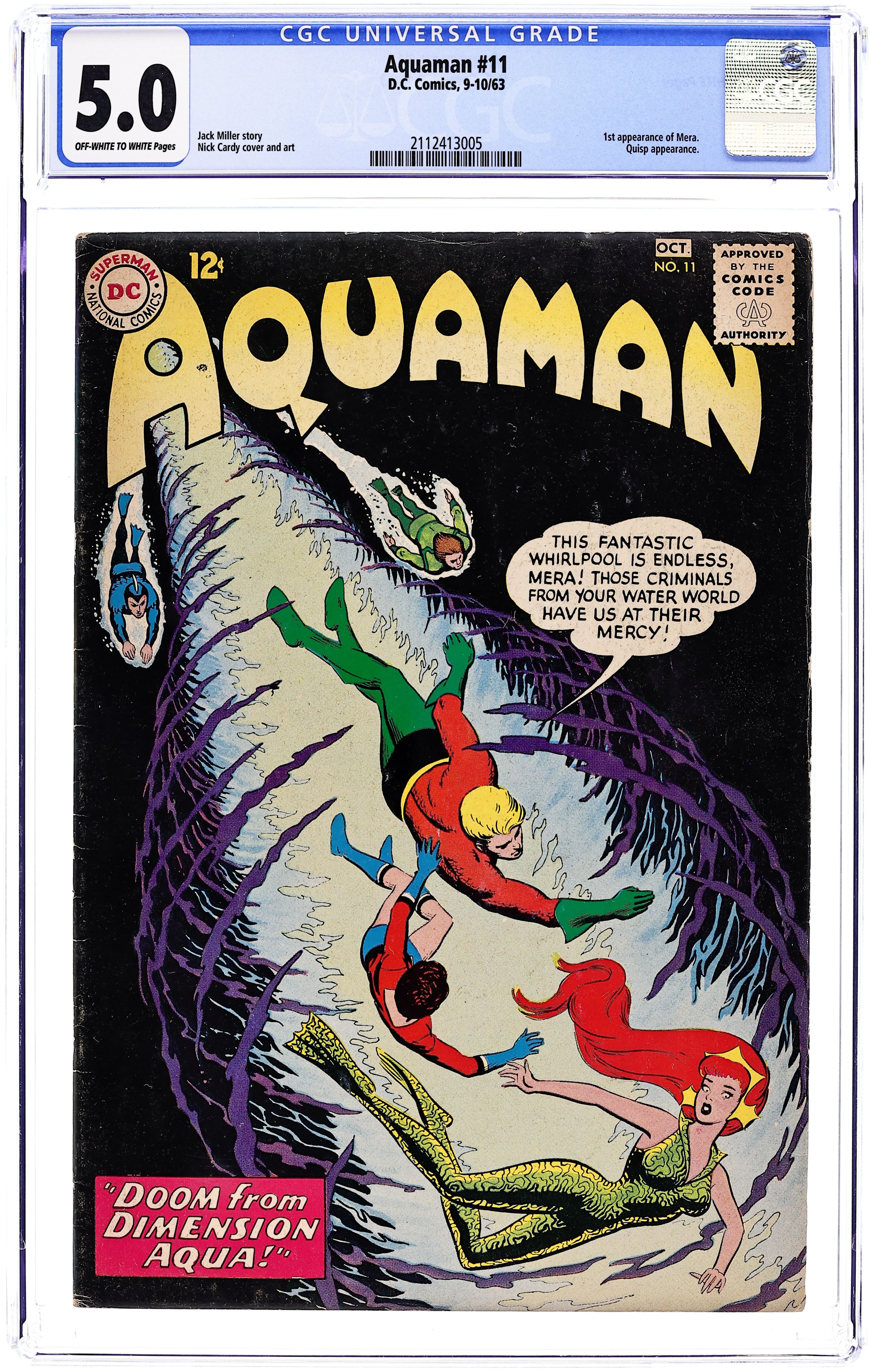 Cover art by Nick Cardy. The Doom From Dimension Aqua, script by Jack Miller, art by Nick Cardy; Aquaman and Aqualad meet Mera, former queen of a watery dimension; people from Mera's home world attack; Mera, who would one day marry Aquaman, makes her first appearance. Homer Goes Skin Diving humor page by Henry Boltinoff. The Fantastic Frogmen article. 36 pgs. $0.12. Cover price $0.12.